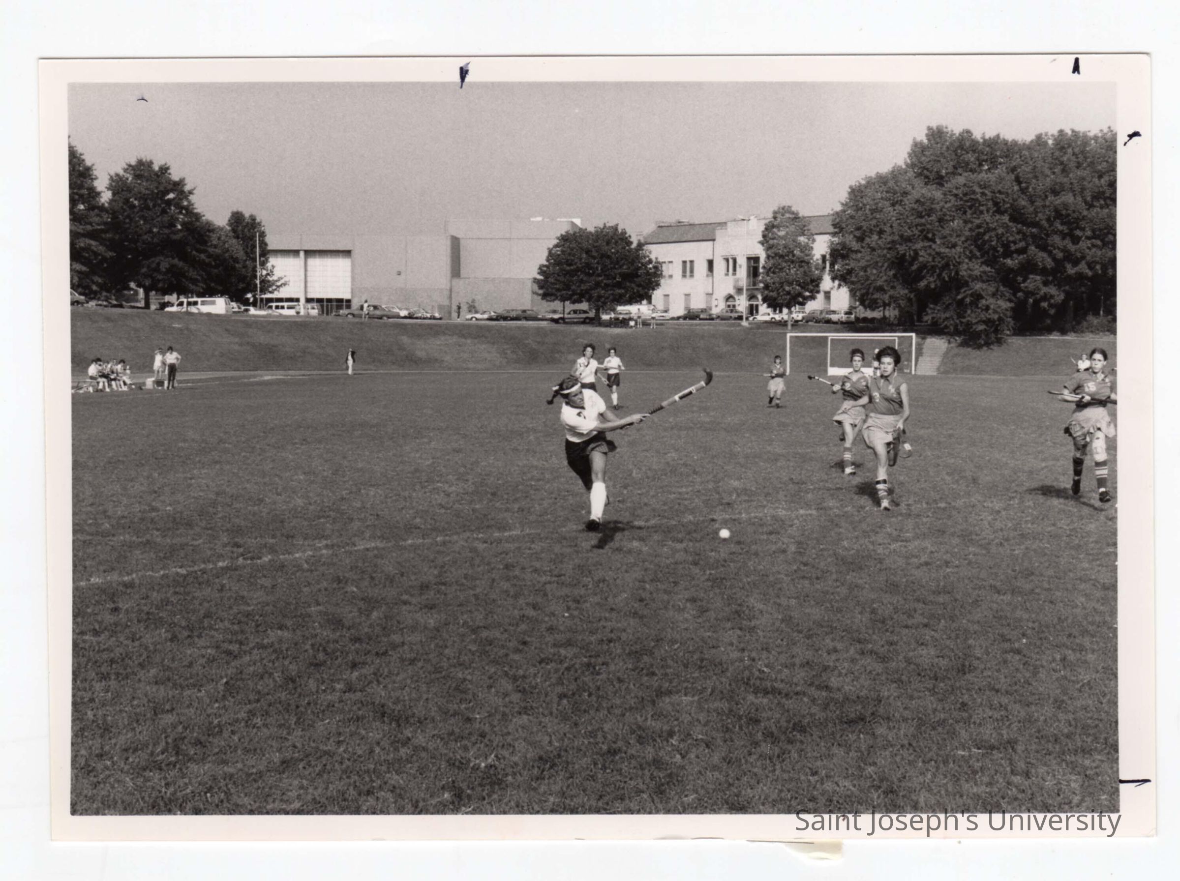 Women's field hockey match on Finnesey Field with Field House/Sports Complex in background.