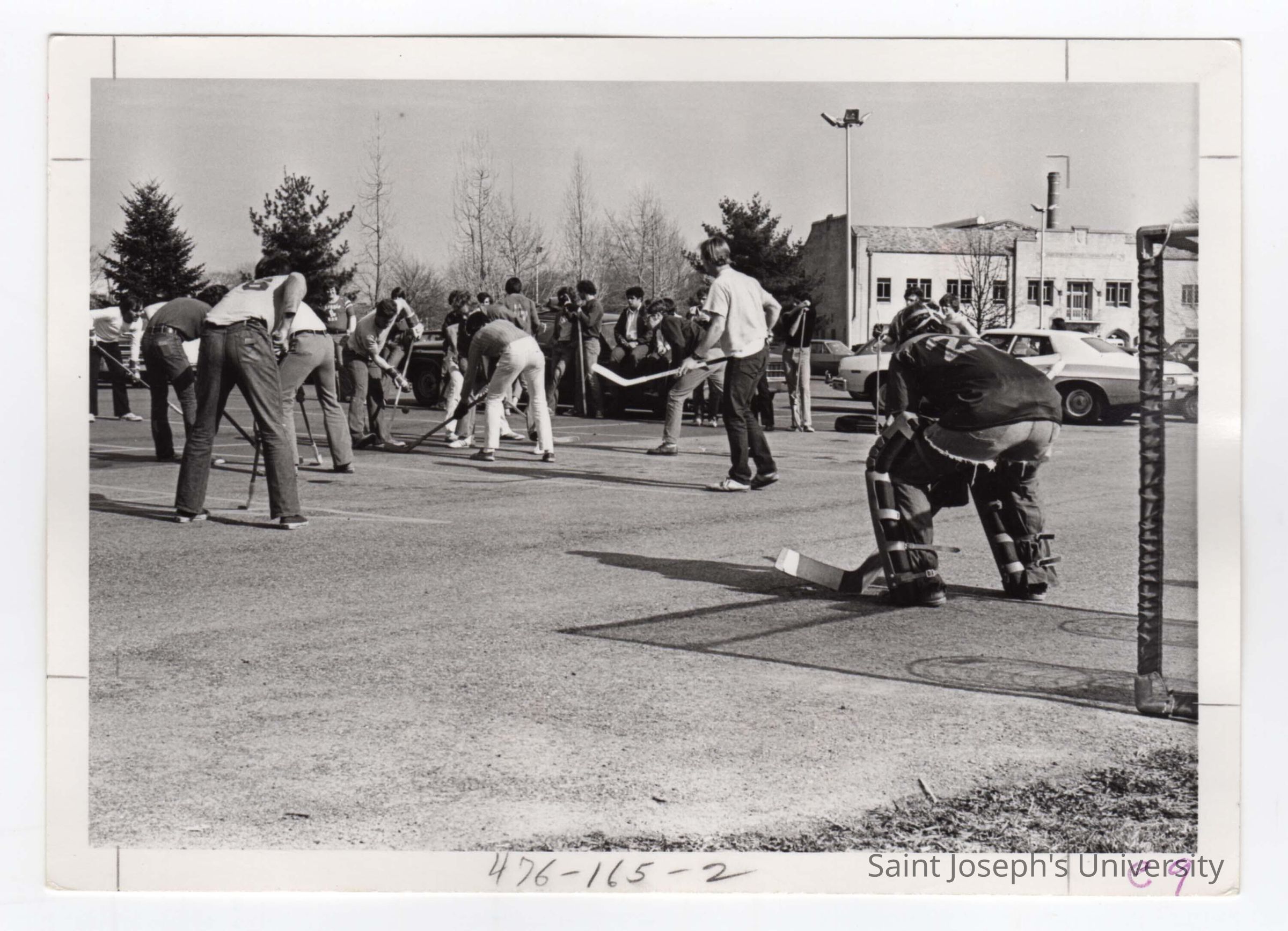 Men's ice hockey team practicing in parking lot with Field House in background.