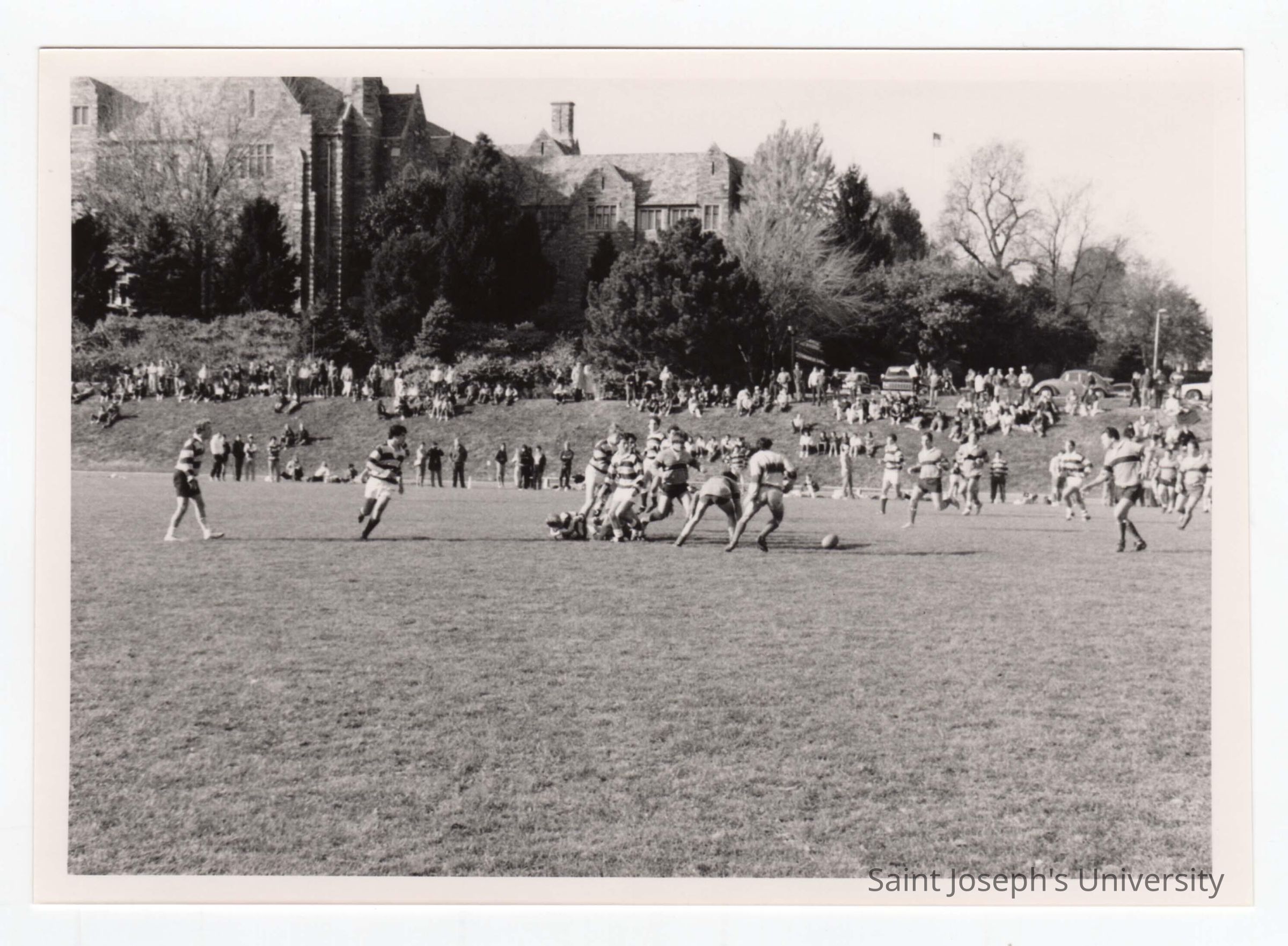 Men's rugby game on Finnesey Field with Barbelin Hall in background.