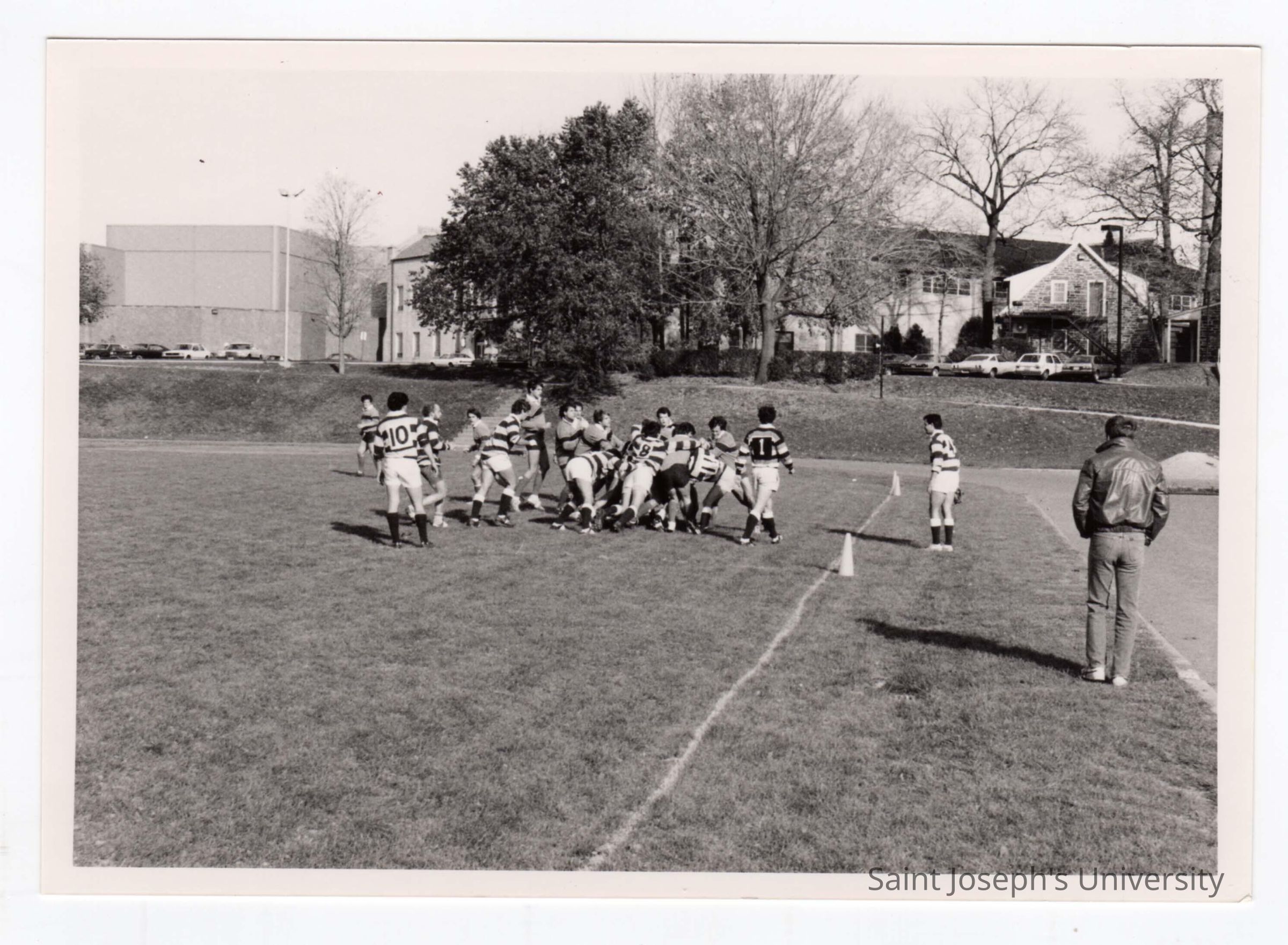 Men's rugby game on Finnesey Field with Field House/Sports Complex in background.