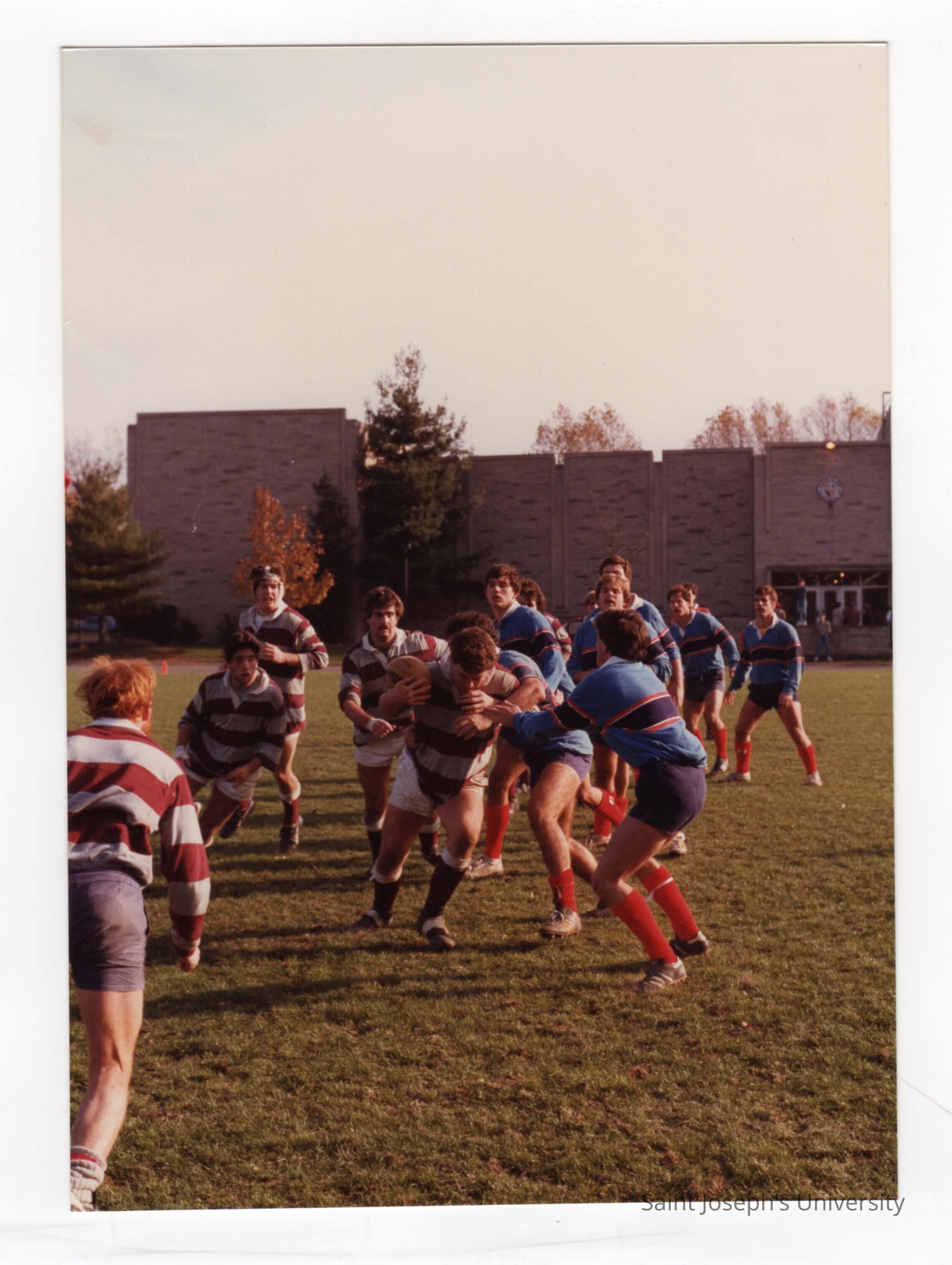 Men's rugby match on Finnesey Field with Post Hall (formerly Villiger) in background.