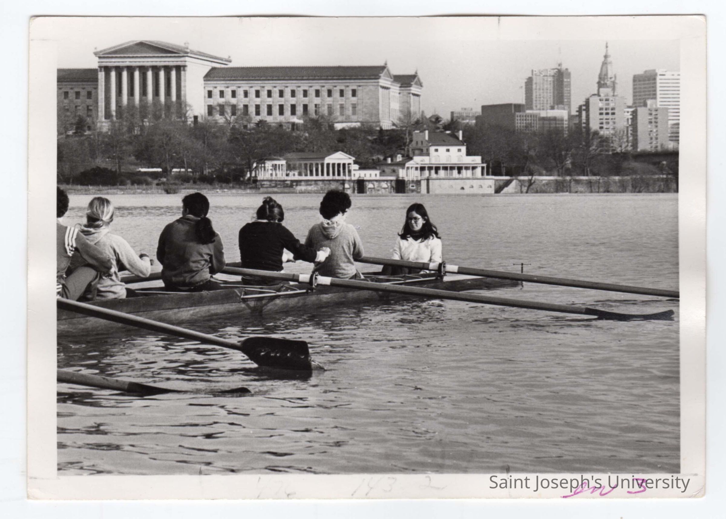 Women's crew/rowing team practicing on Schuylkill River with Boathouse Row and Philadelphia Museum of Art in background.