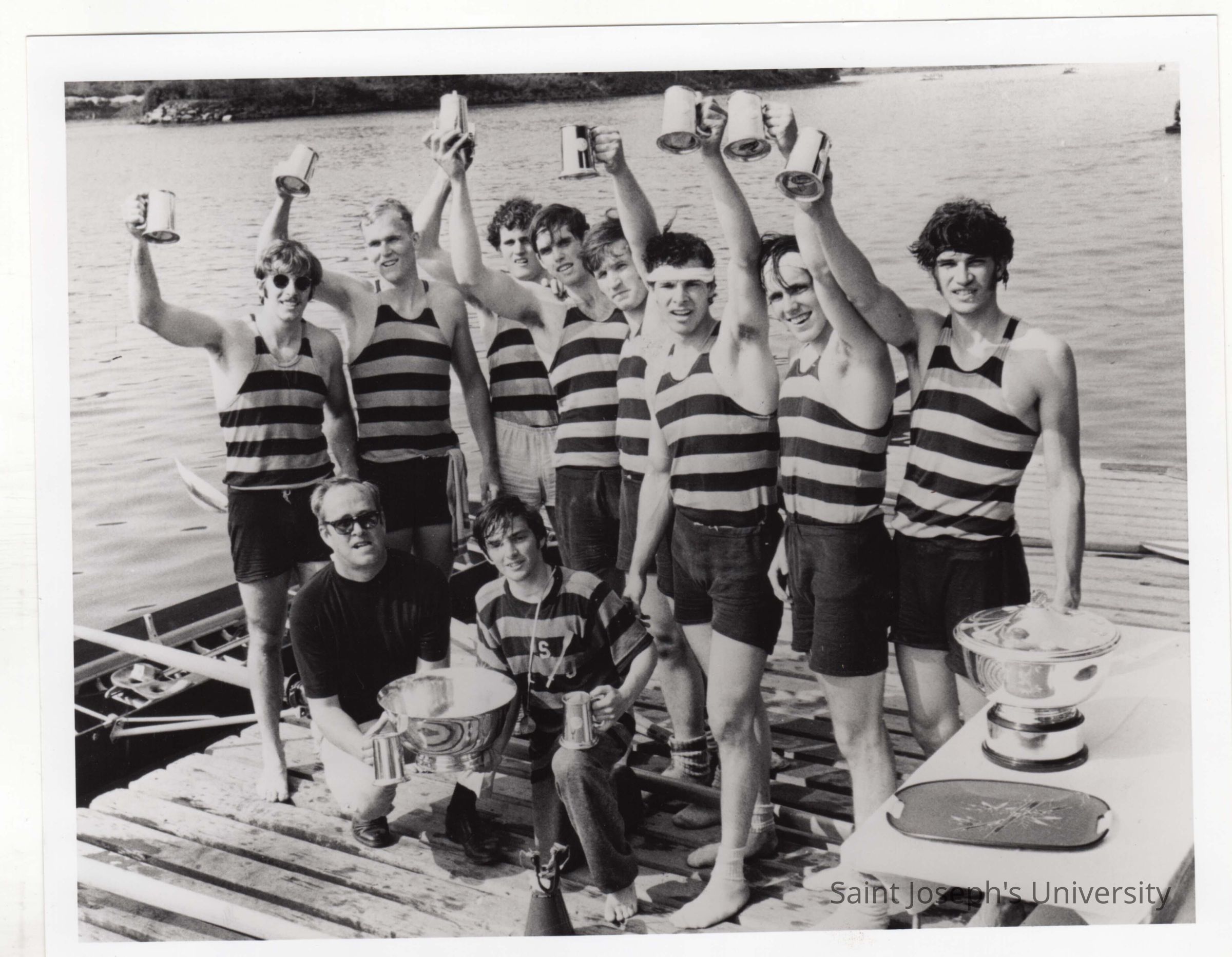 Members of men's crew/rowing team with Dad Vail Regatta trophy, 1970.