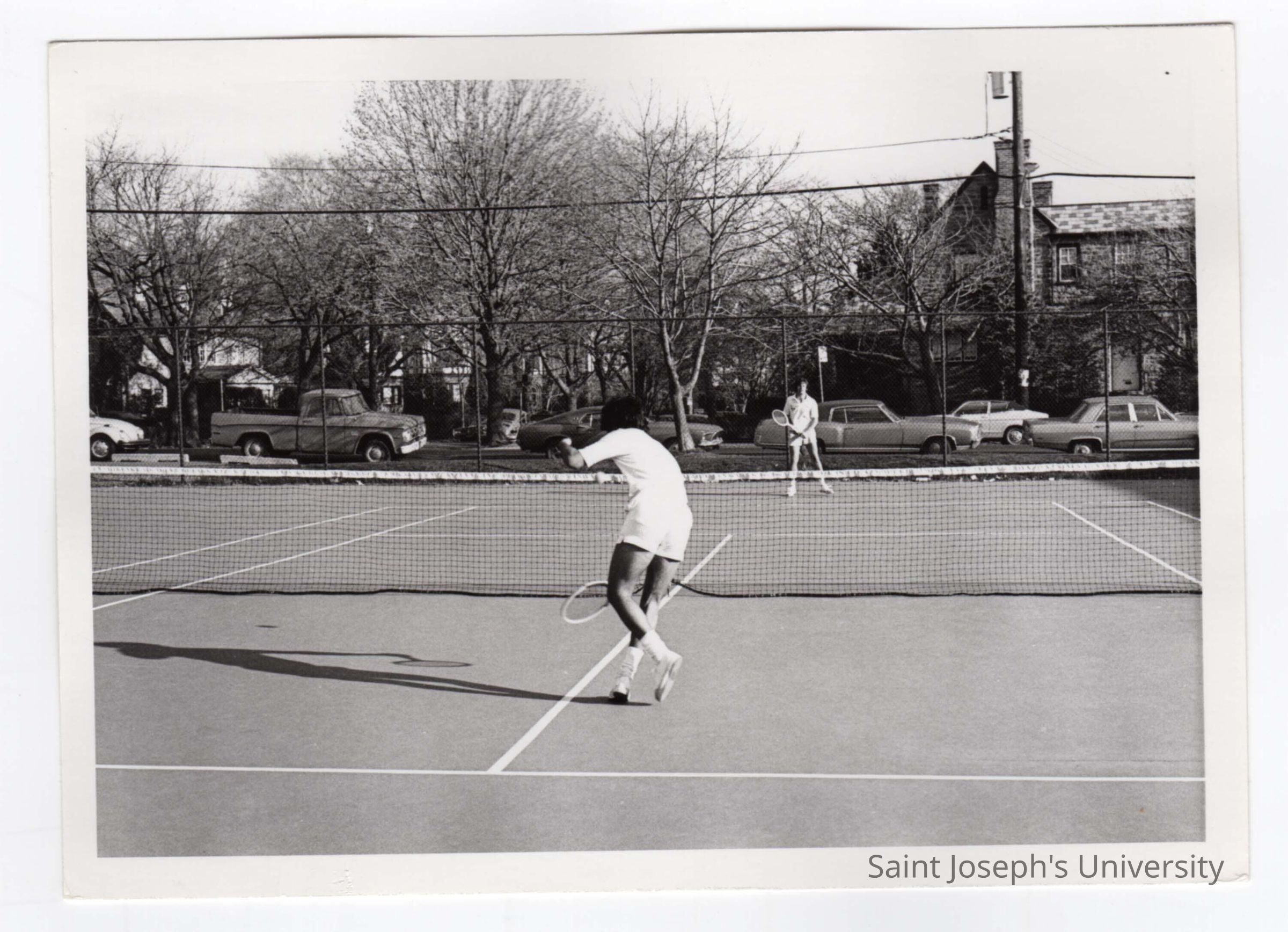 Two members of men's tennis team practicing on court with cars parked on street and neighborhood in background.