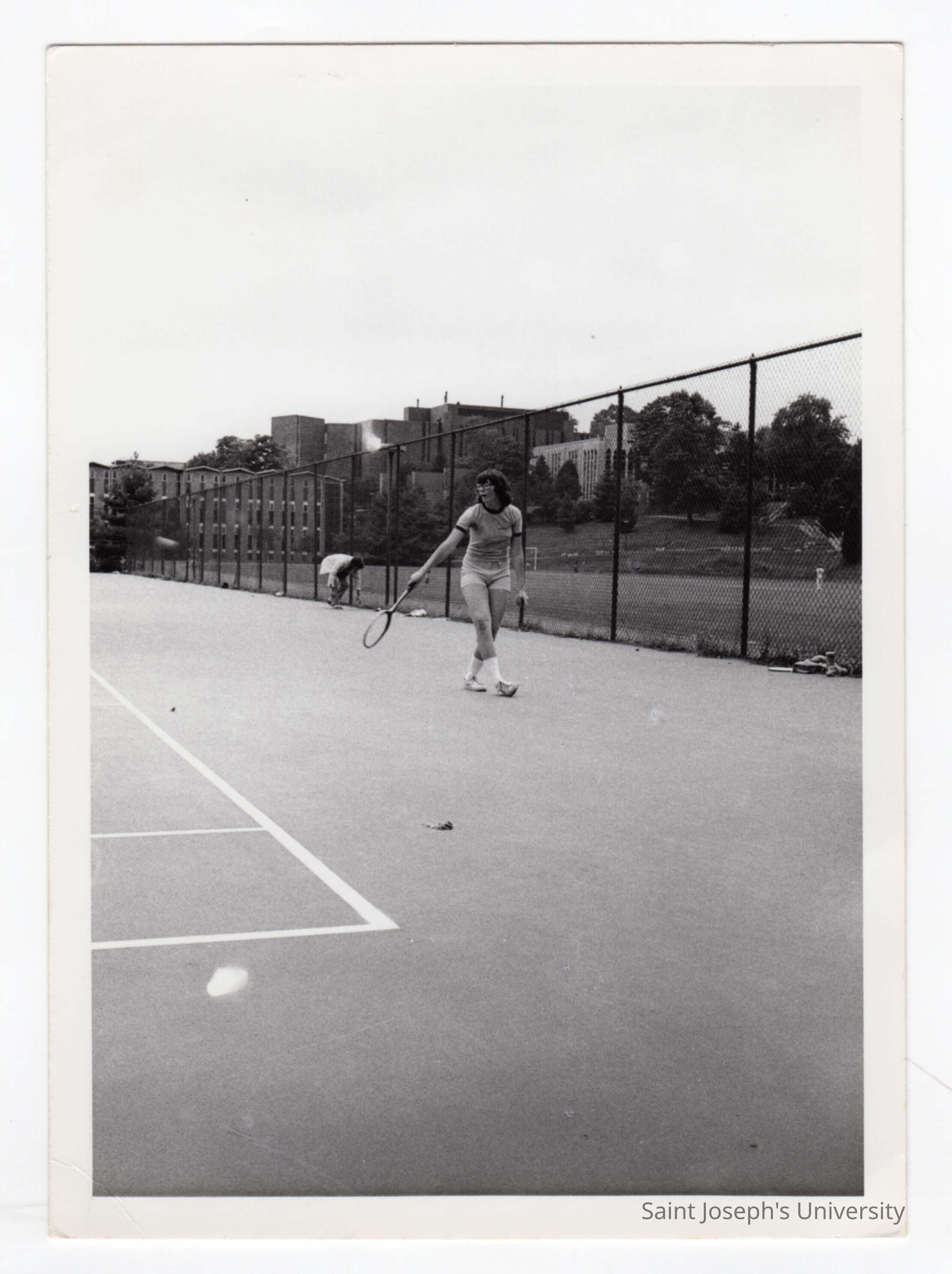 Women's tennis team team member practicing with Finnesey Field, Bellarmine, Science Center, and Drexel Library in background.