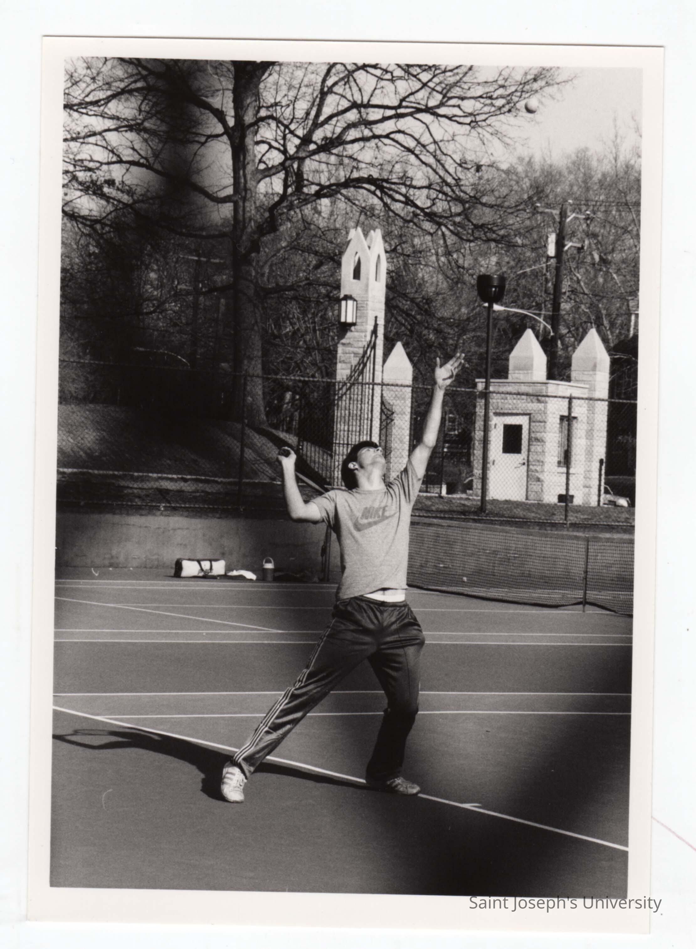 Men's tennis team member practicing with guard's kiosk and entrance gate in background.