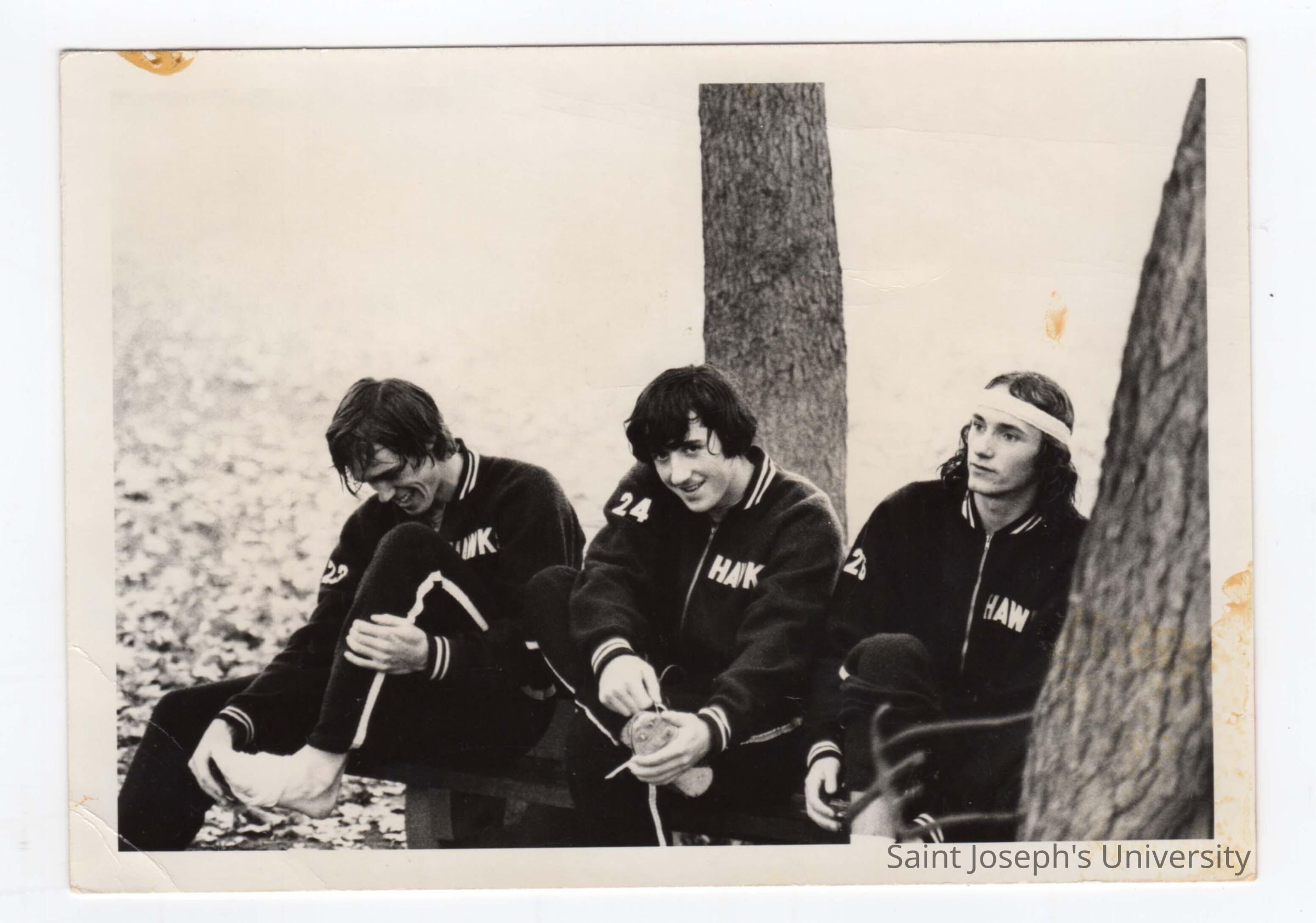 Three members of men's track team sitting on ground taking off shoes and wearing warm-up suits.