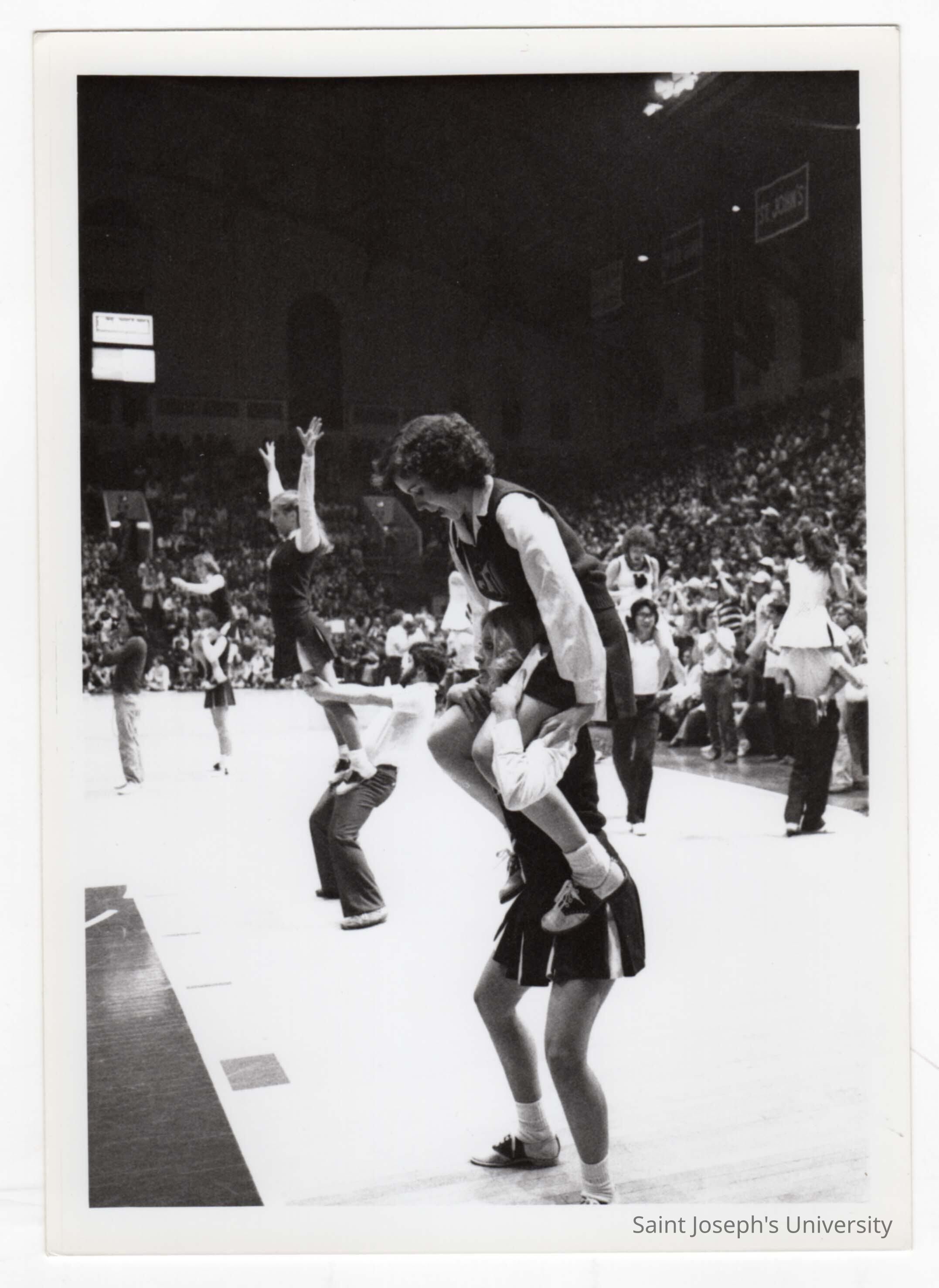 Men and women in two-person pyramids at basketball game.