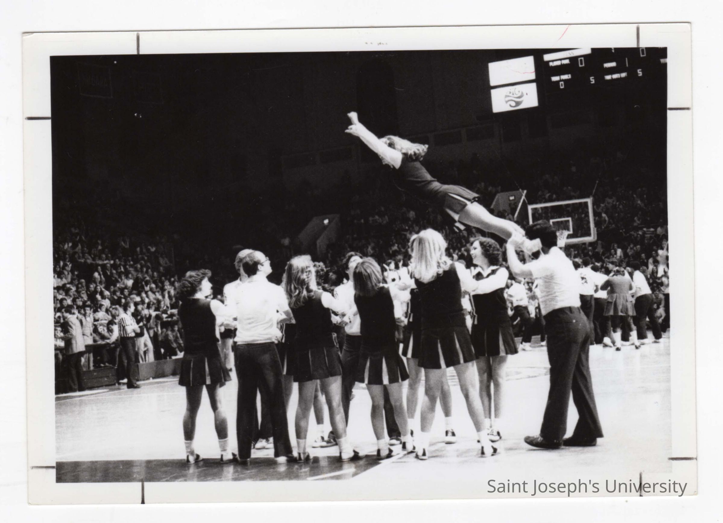 Men and women cheerleaders in circle catching cheerleader during basketball game.