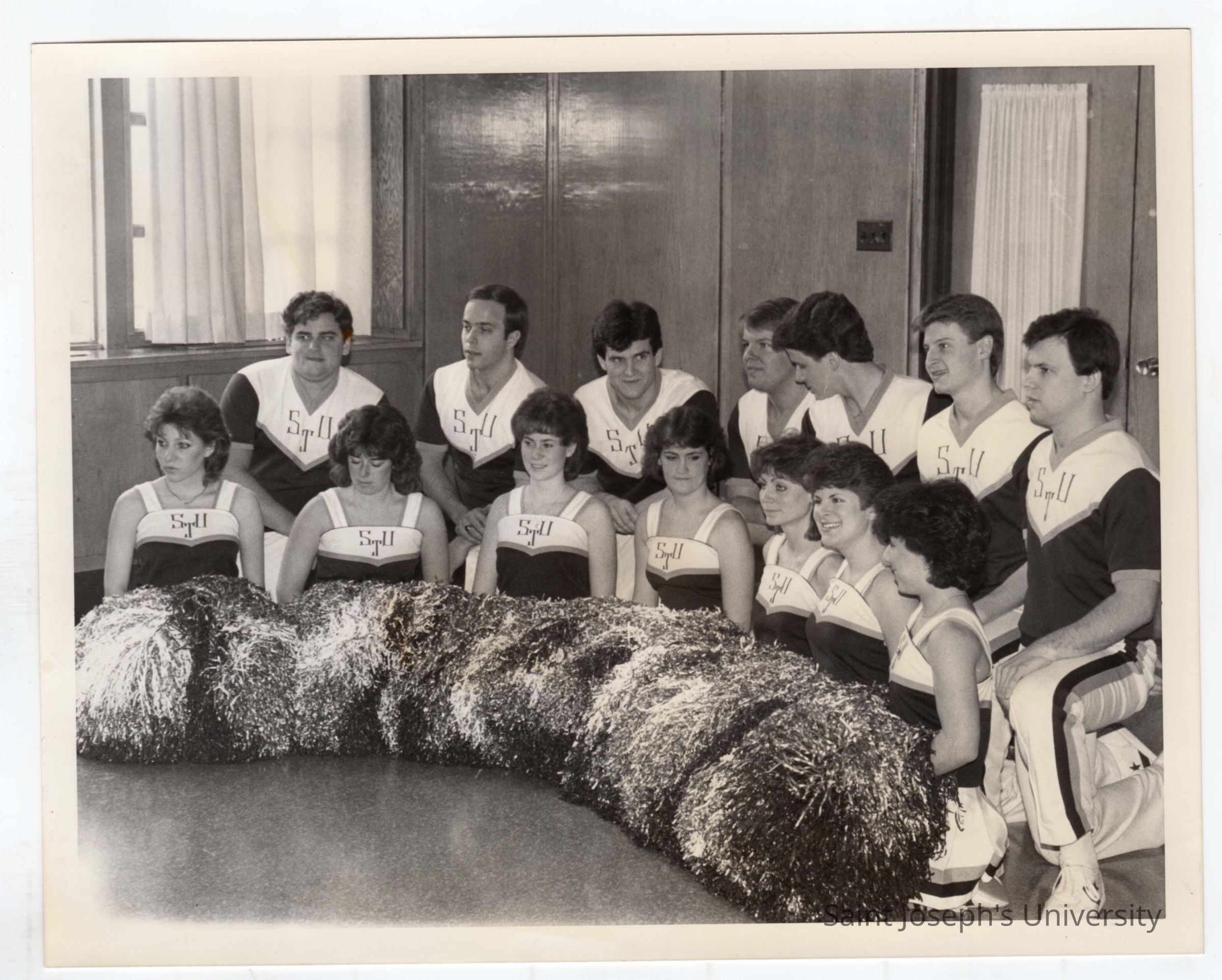 Group photo of men and women cheerleaders.