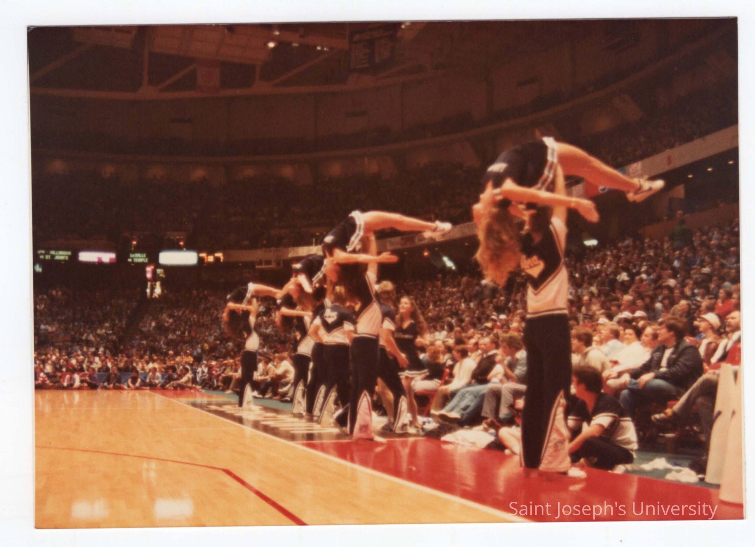 Men and women cheerleaders at basketball game performing routine.