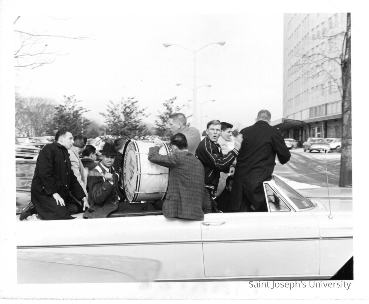 Student booster club pep rally/car parade down City Avenue. Students playing drum in convertible.