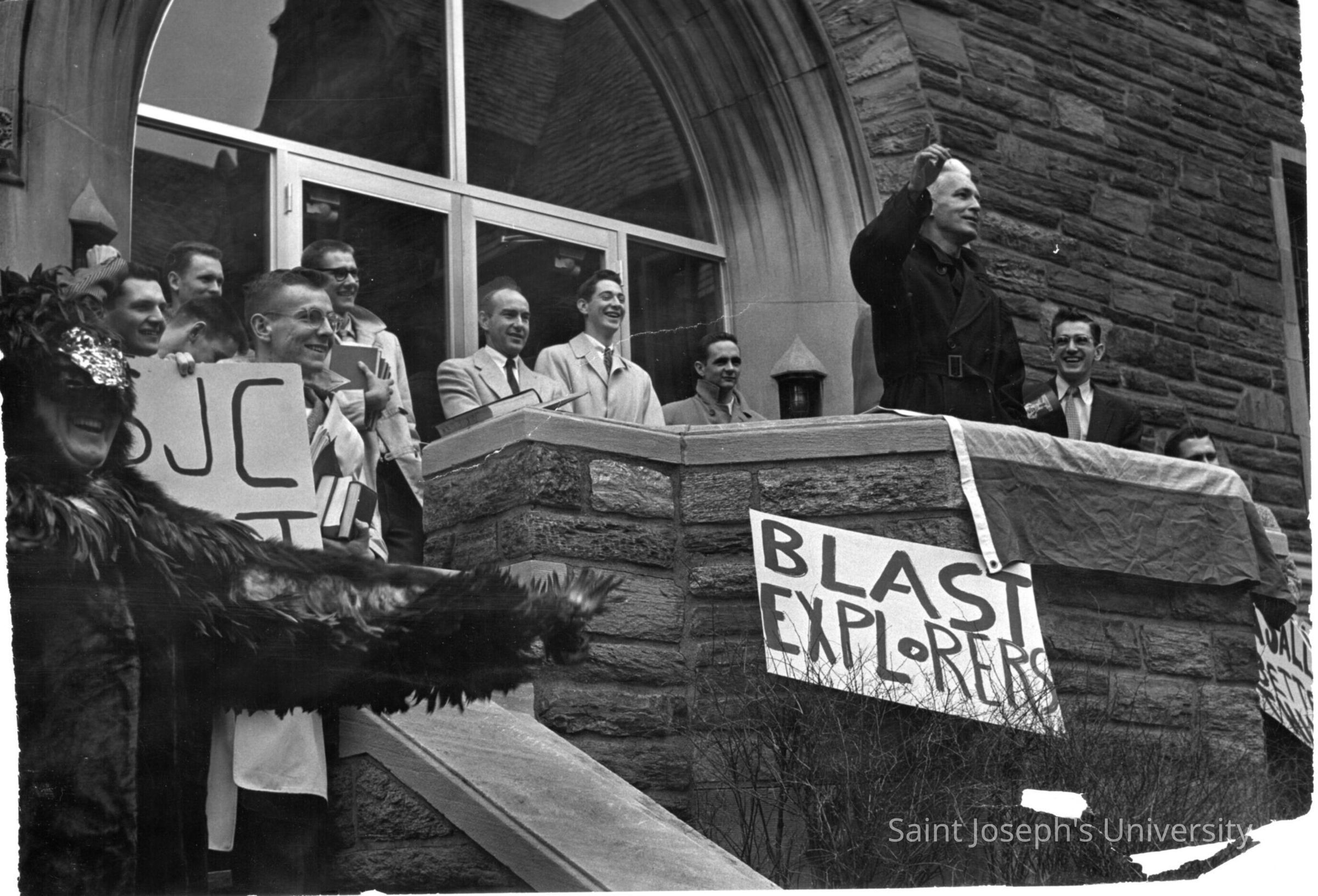 Students, Hawk mascot, Francis Emory, S.J. at blast explorers pep rally.
