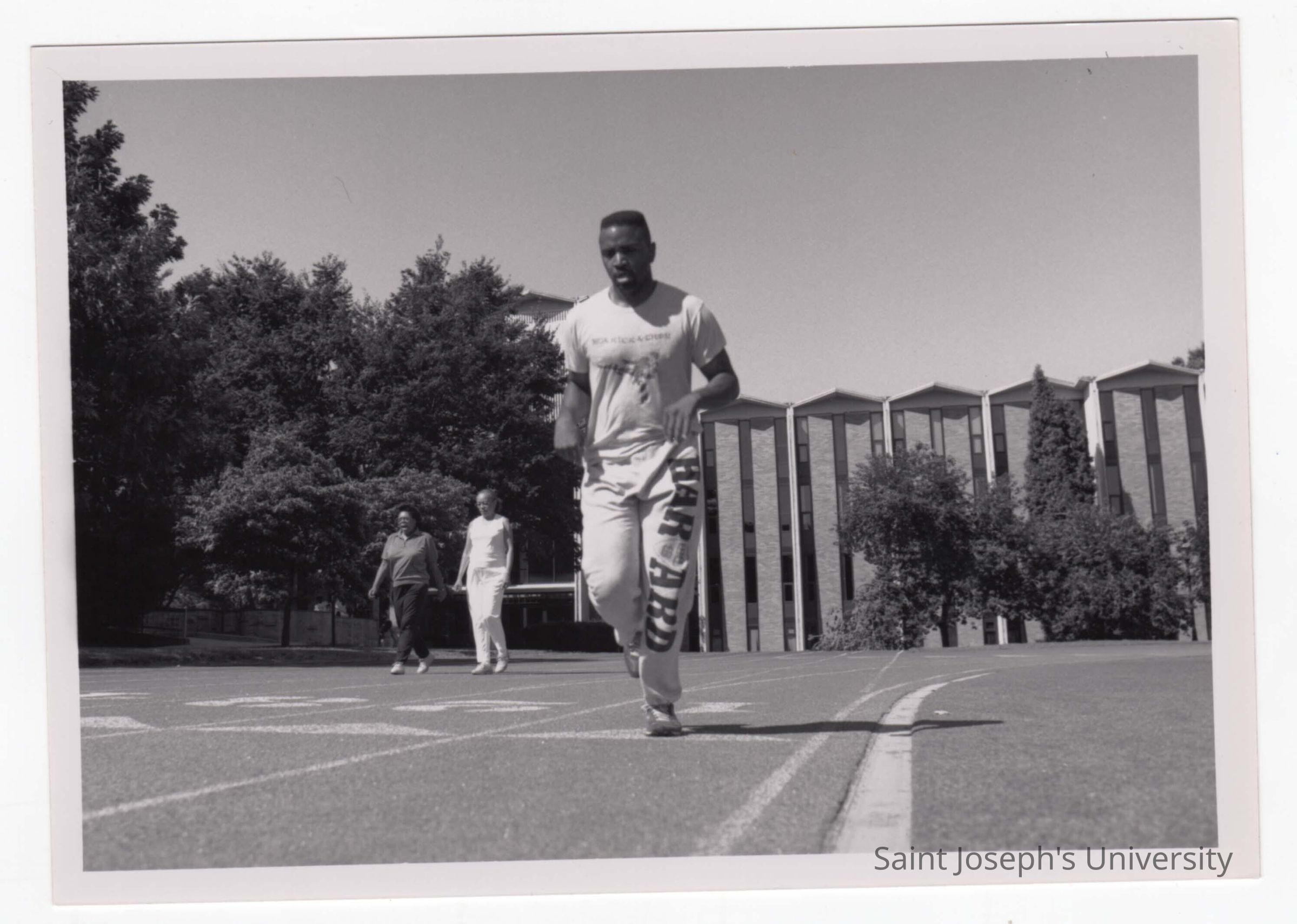 Student running on track with two neighborhood (?) women walking and Bellarmine Hall in background.