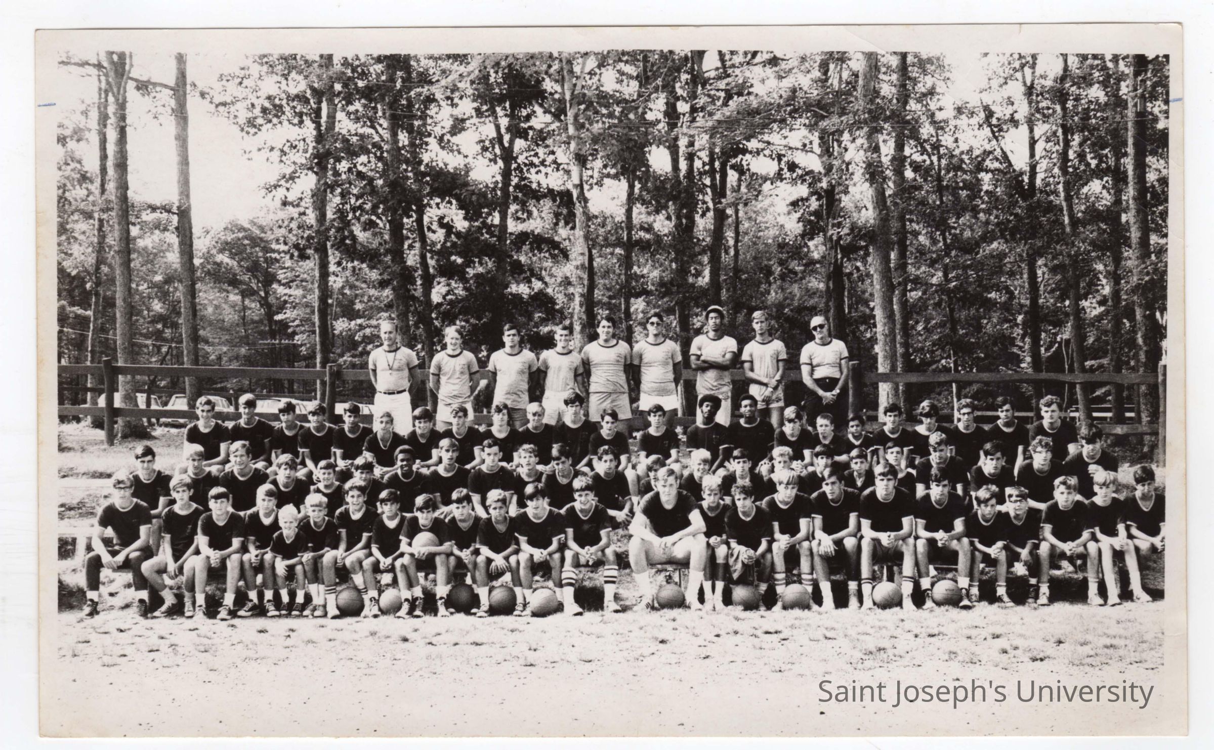 Group photo of boys summer basketball camp with sixty campers and ten coaches.