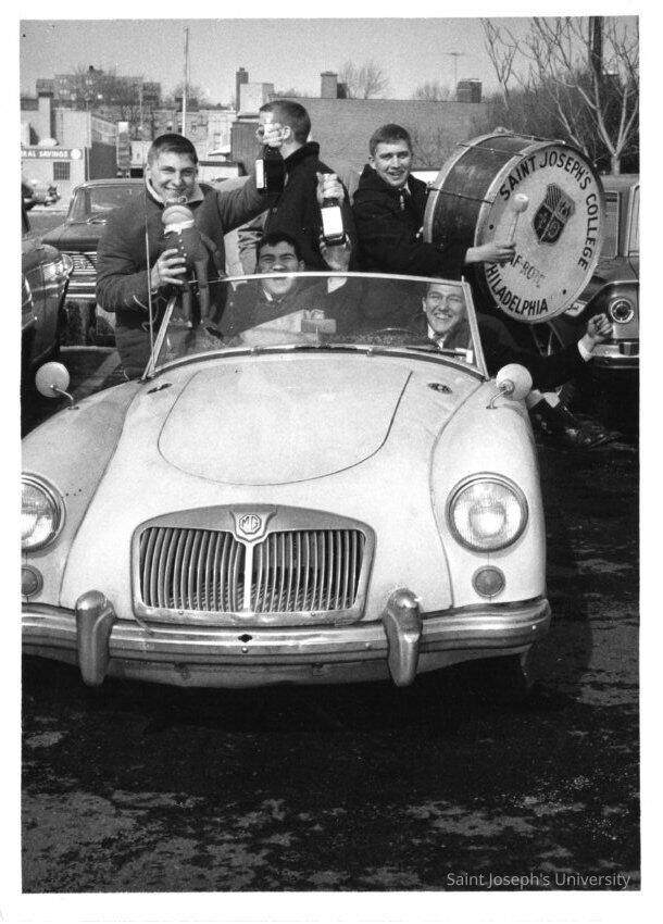 Students, including John Lehman and Al Tegler, driving in convertible automobile during booster club pep rally. Lehman is driving and Tegler is holding Air Force ROTC drum.Entry/Object ID
