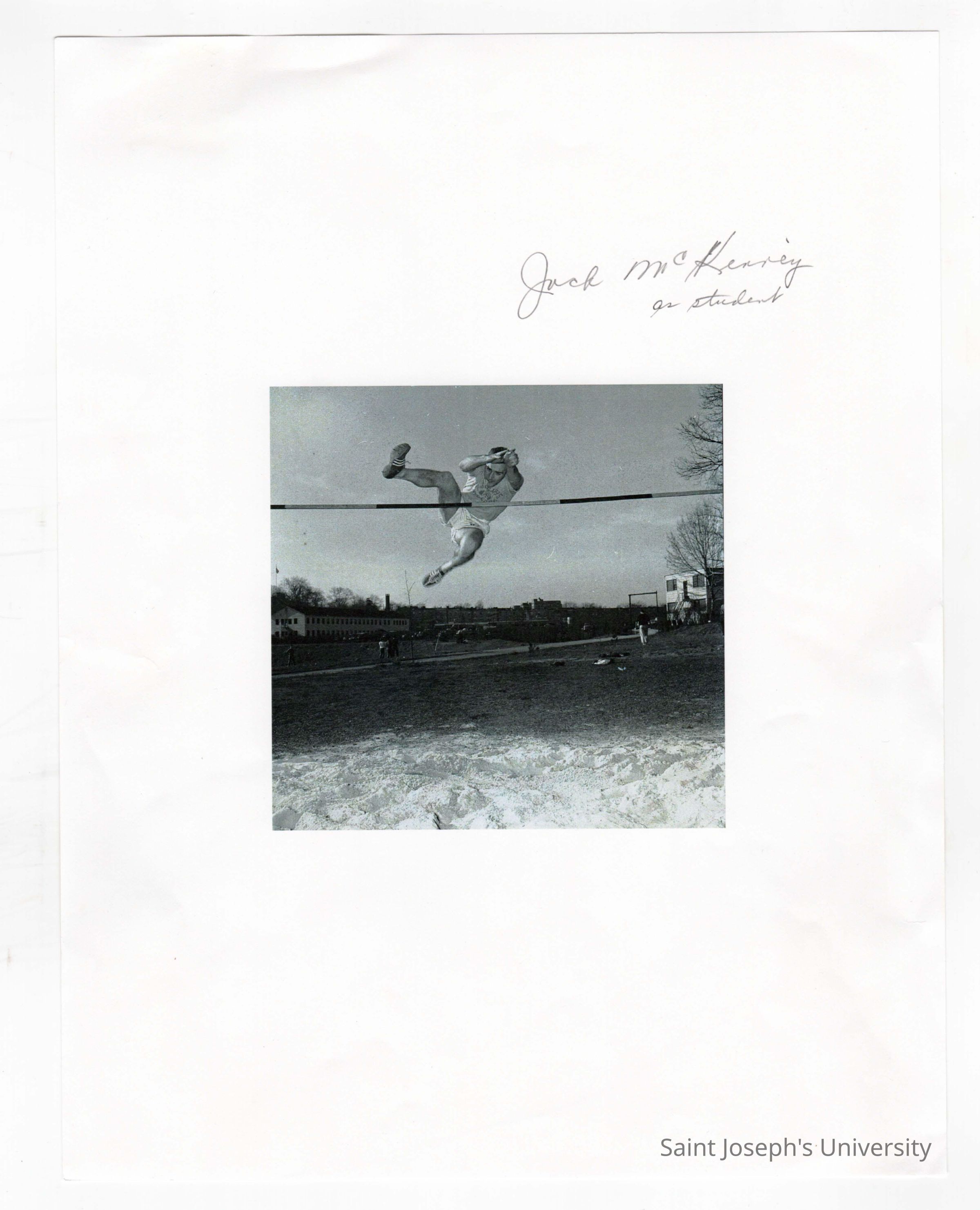 Student Jack McKinney in track and field high jump event at the Middle Atlantic Conference in 1957.