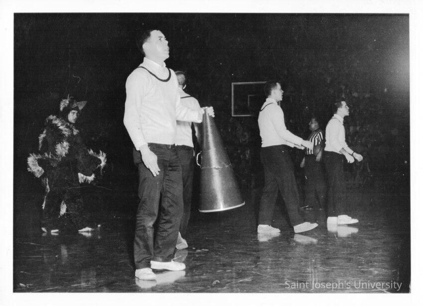 Men's Basketball, cheerleaders with megaphone and Hawk Mascot at game.