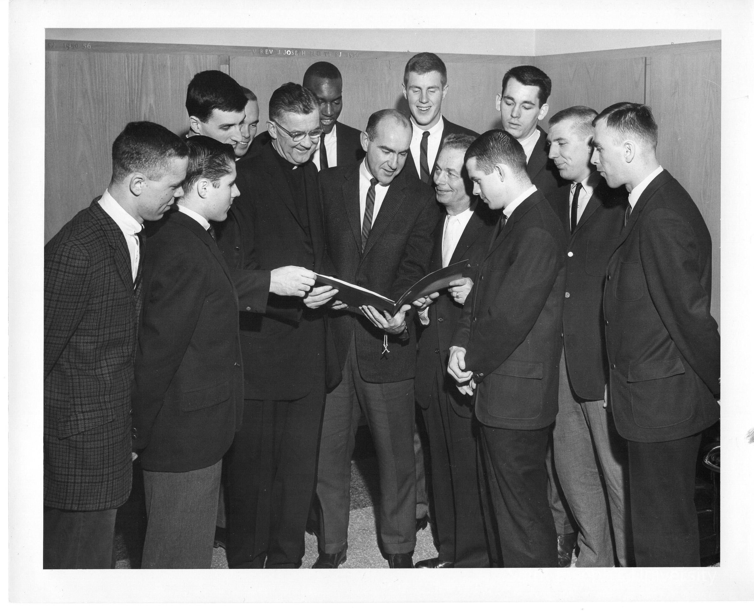 Men's Basketball Coach Jack Ramsay, Pres. Maloney, and Players