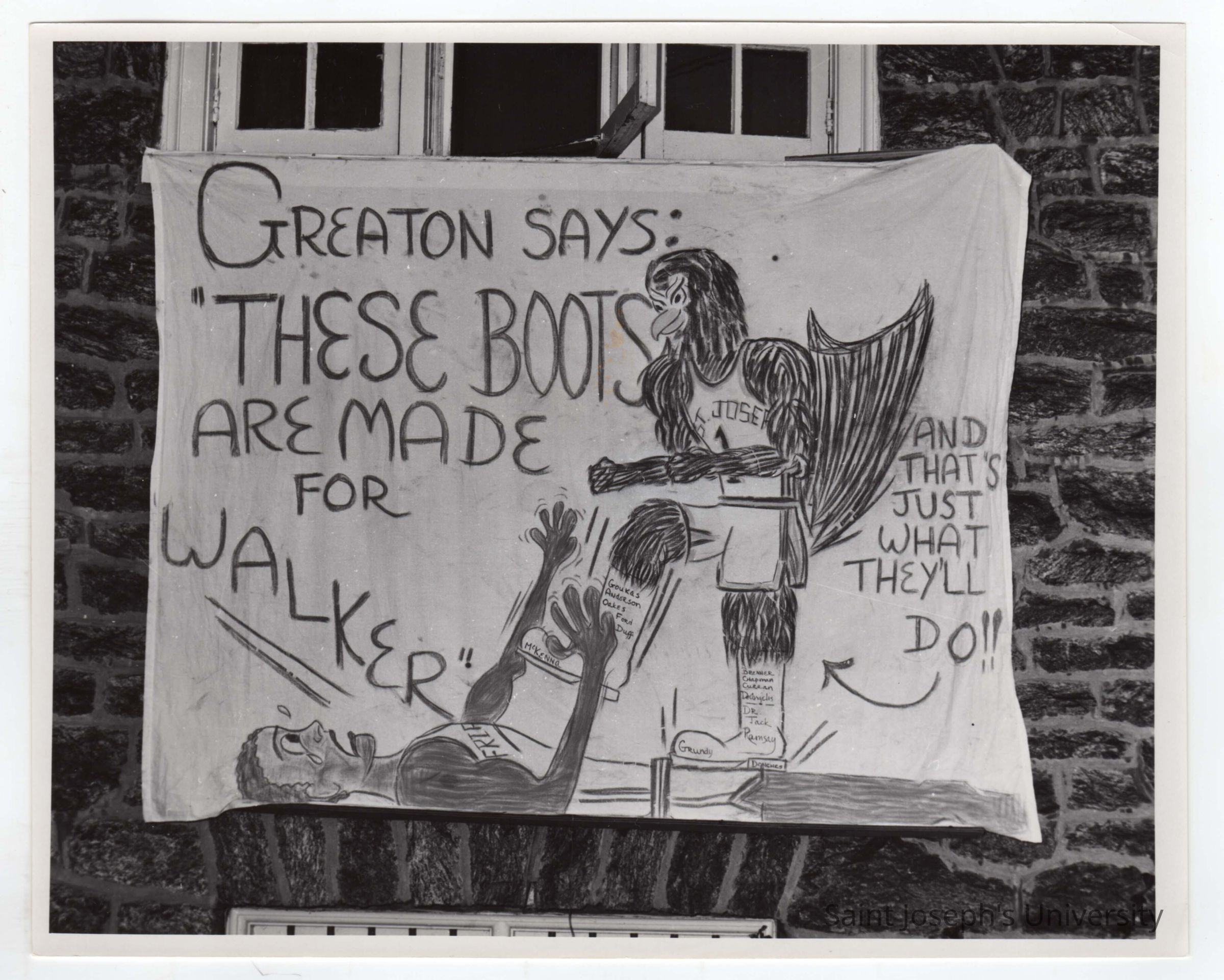 Men's Basketball banner hanging outside Greaton Residence Hall