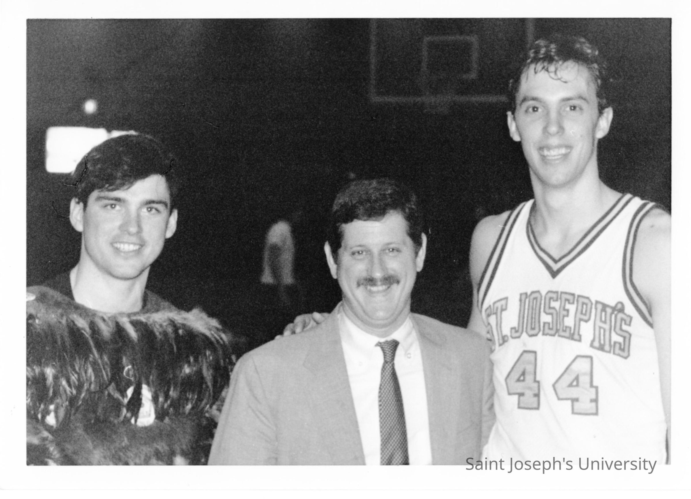 Men's Basketball player Bob Lojewski with Hawk mascot and Athletic Director, Mike Shultz