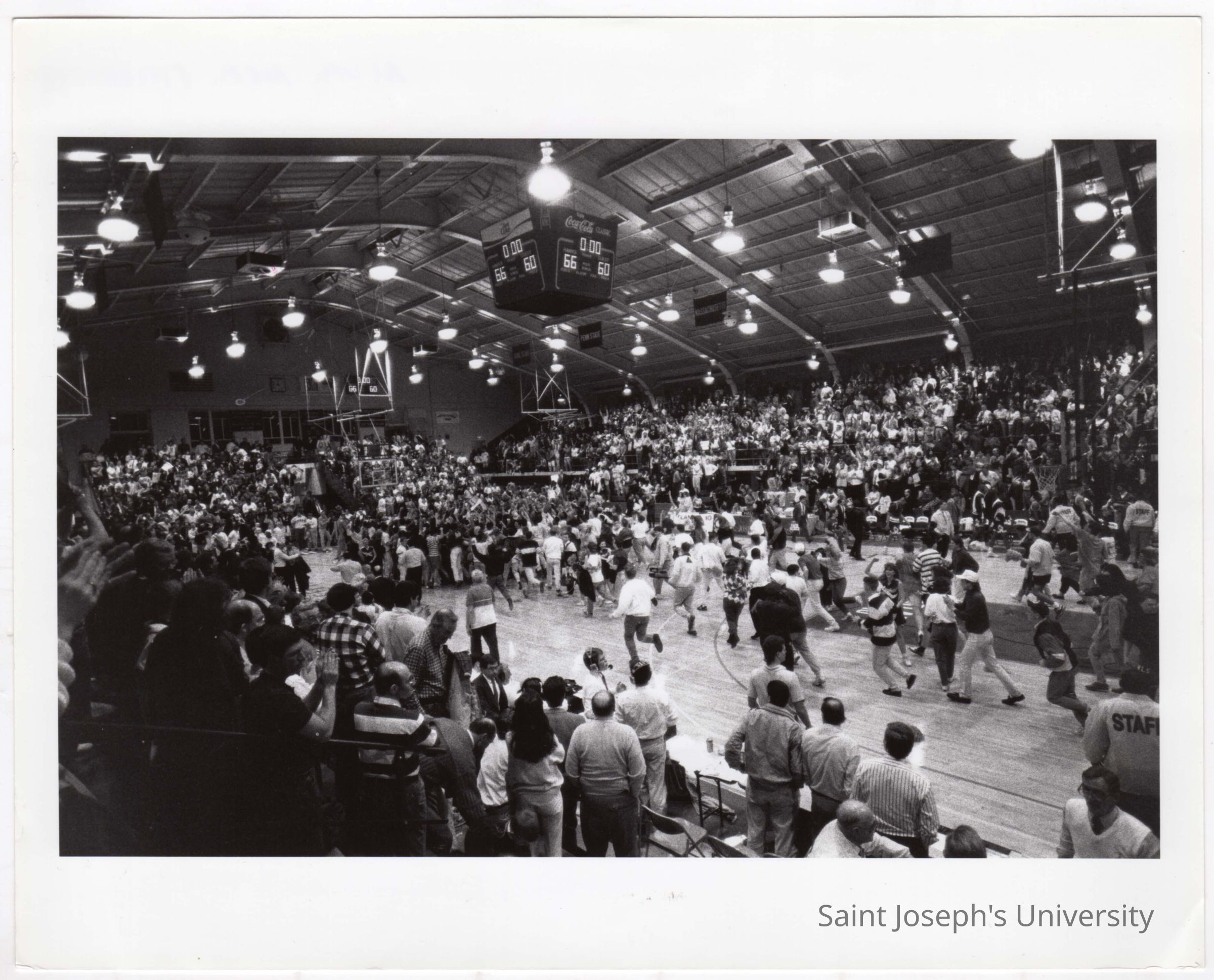 Students celebrating after Men's Basketball victory in Fieldhouse
