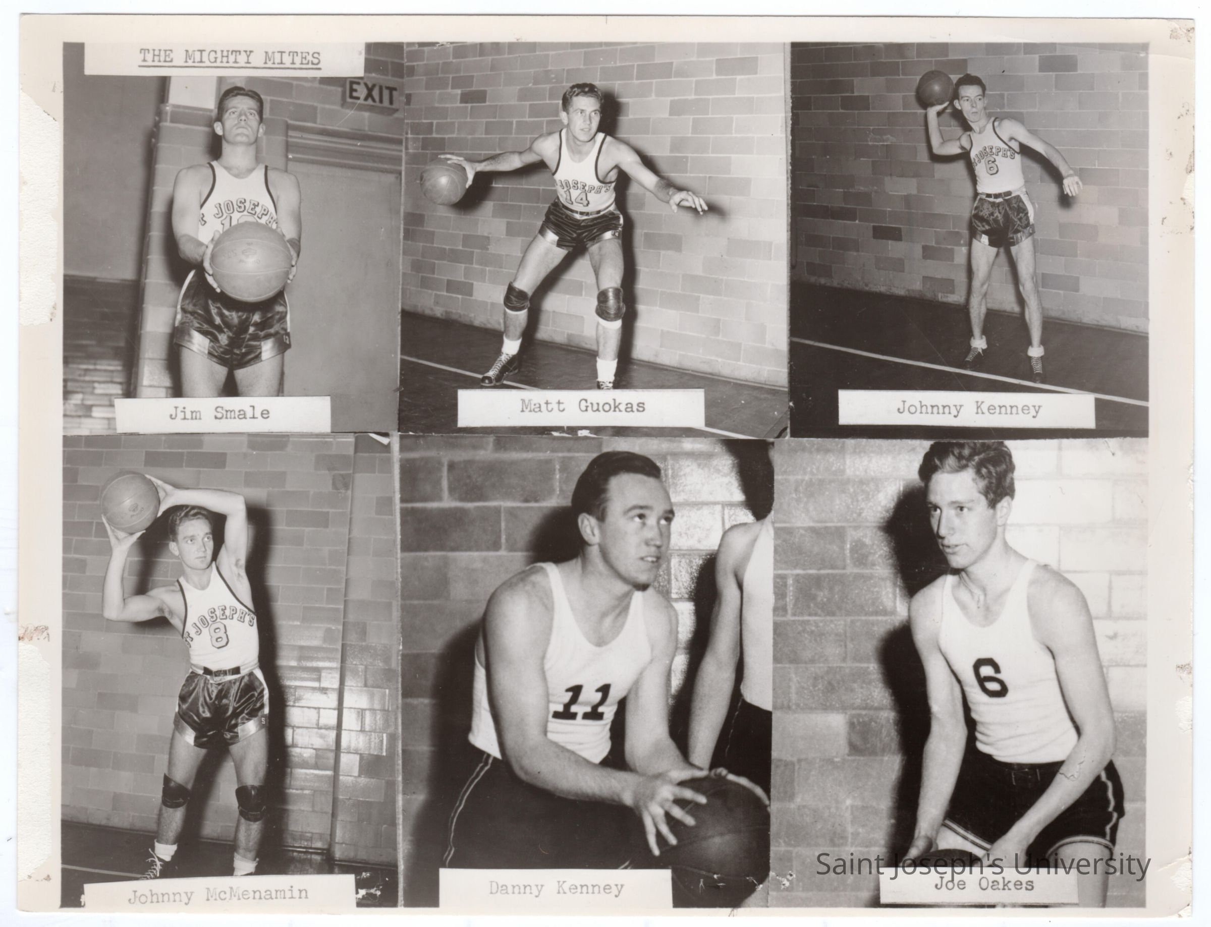 Members of men's basketball team known as Mighty Mites, including Jim Smale, Matt Guokas, Johnny Kenney, Johnny McMenamin, Danny Kenney, and Joe Oakes.
