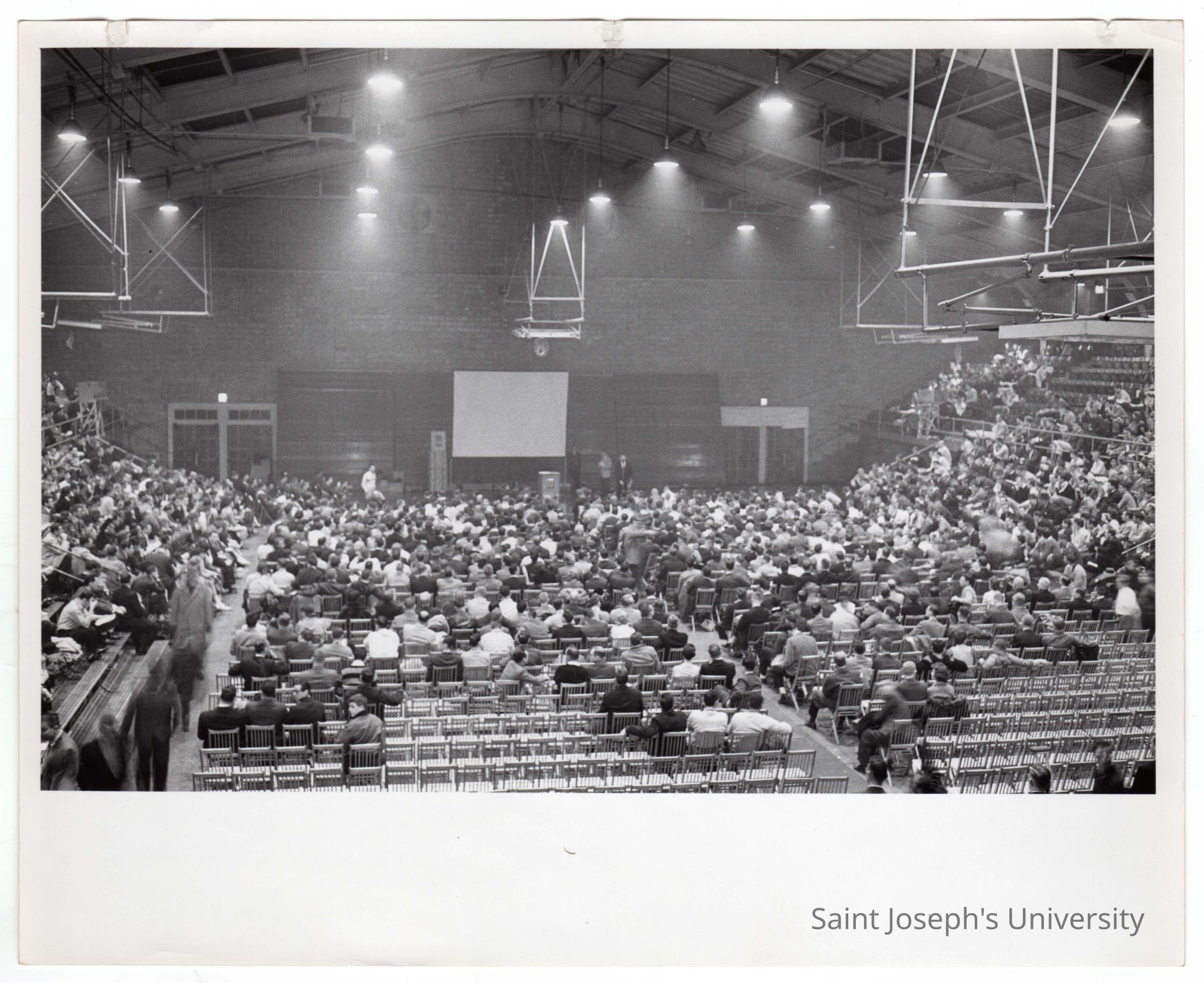 View of closed circuit telecast and audience in Field House broadcasting game in 1960 NCAA basketball tournament in Charlotte, North Carolina.