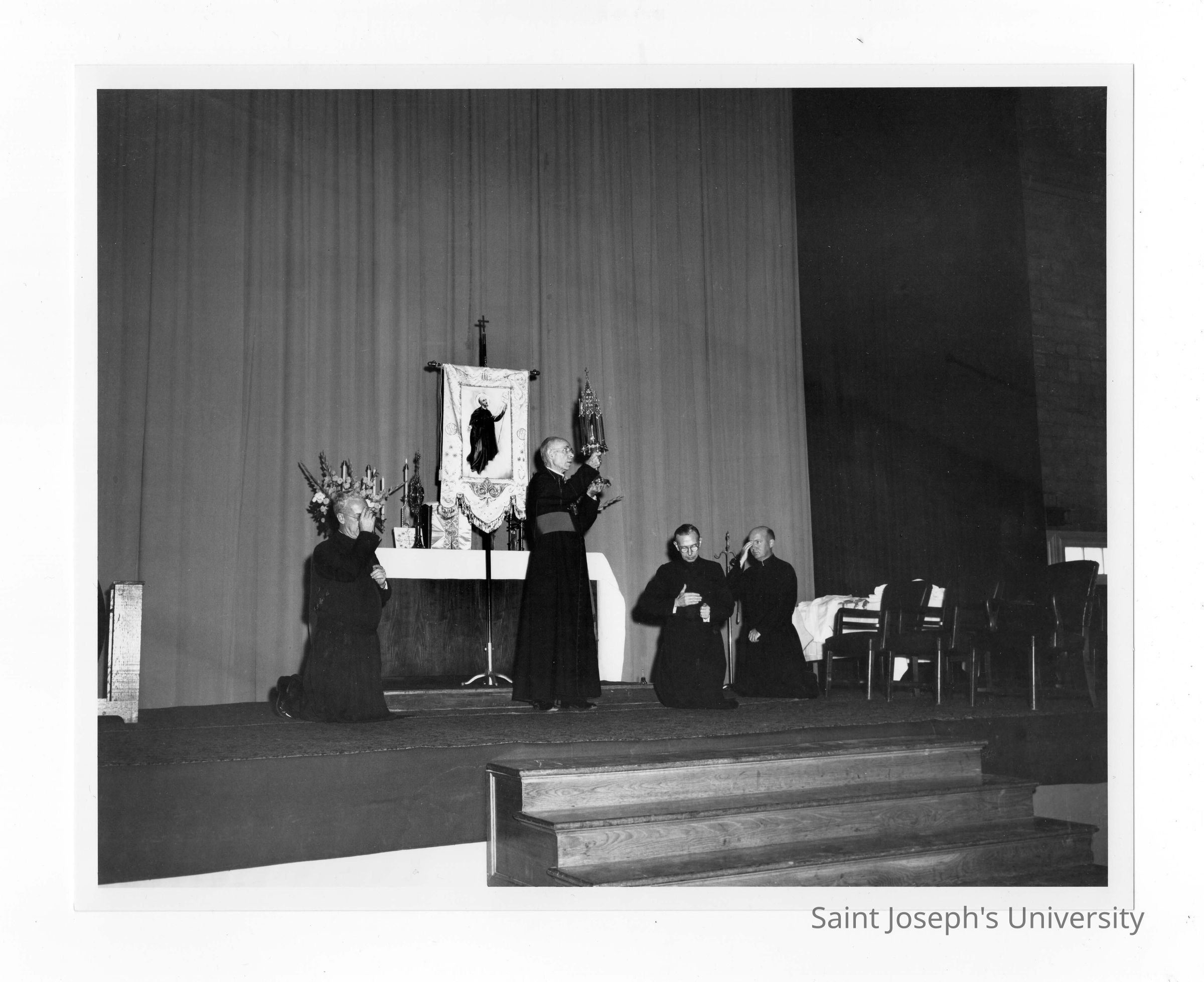 Academic Convocation on March 22, 1956 for the Fourth Centenary of Death of Saint Ignatius Loyola. Archbishop John O'Hara gives blessing to J. Joseph Bluett, S.J., Fr. James Mortimer, Joseph McNamara, S.J., and congregation in Field House after Mass.Entry/Object ID