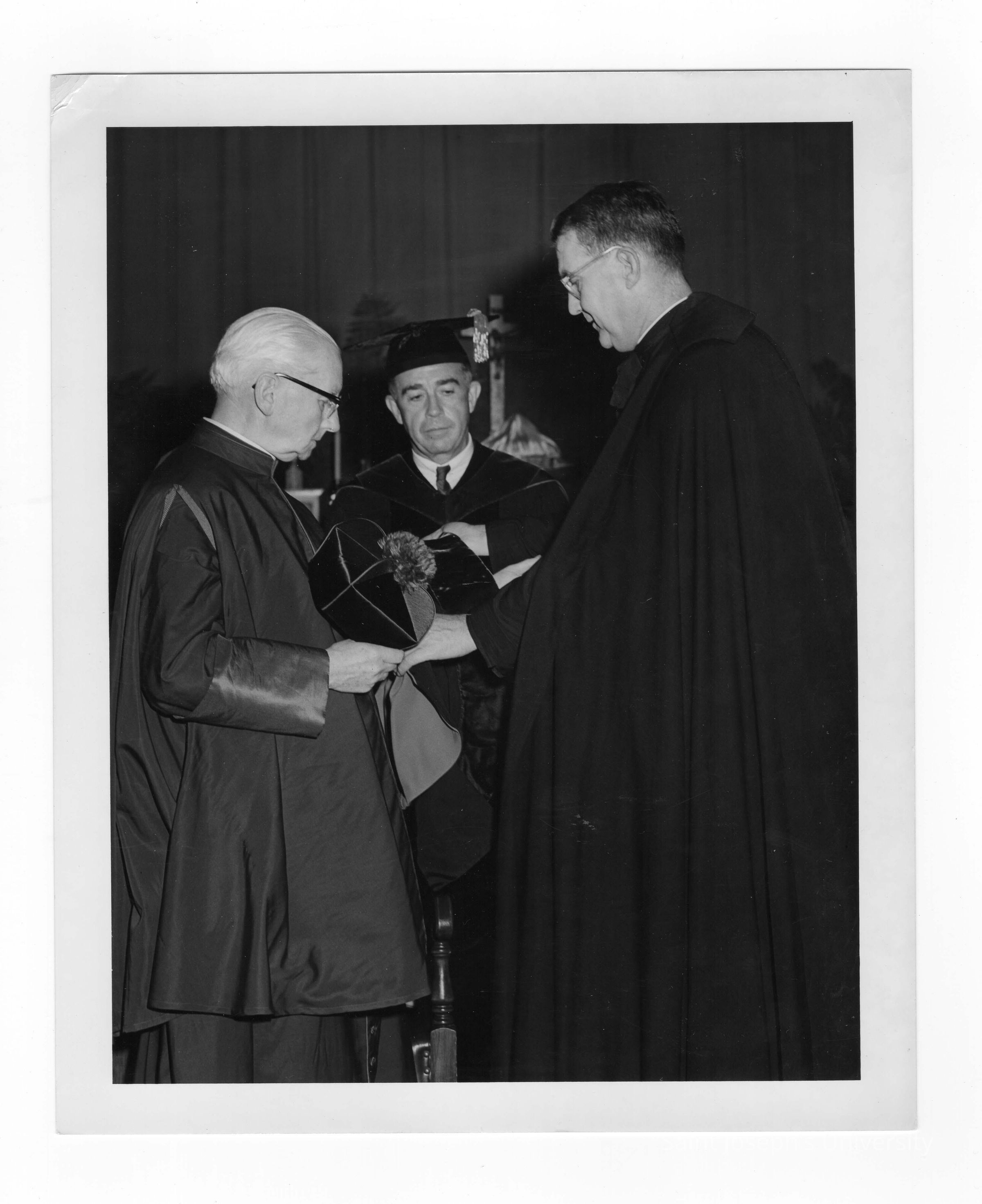 William F. Maloney, S.J., and Michael Boland help Monsignor Francis Brennan don his hood during convocation, September 13, 1962.