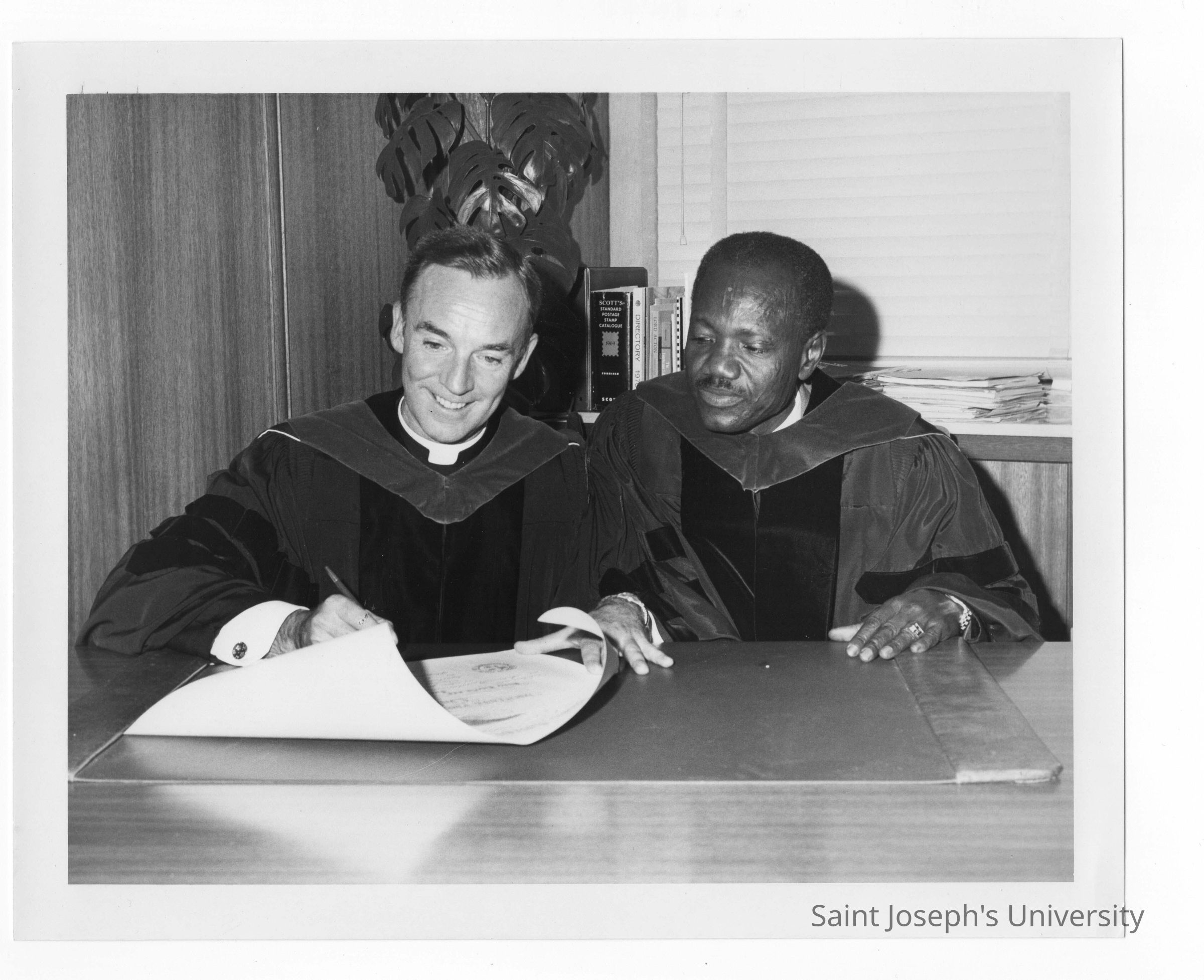 Terrence Toland, S.J., signing honorary degree for the President of Chad, Francois Tombalbaye, during convocation, October 26, 1970. The event was in observance of the twenty-fifth anniversary of the founding of the United Nations.Entry/Object ID