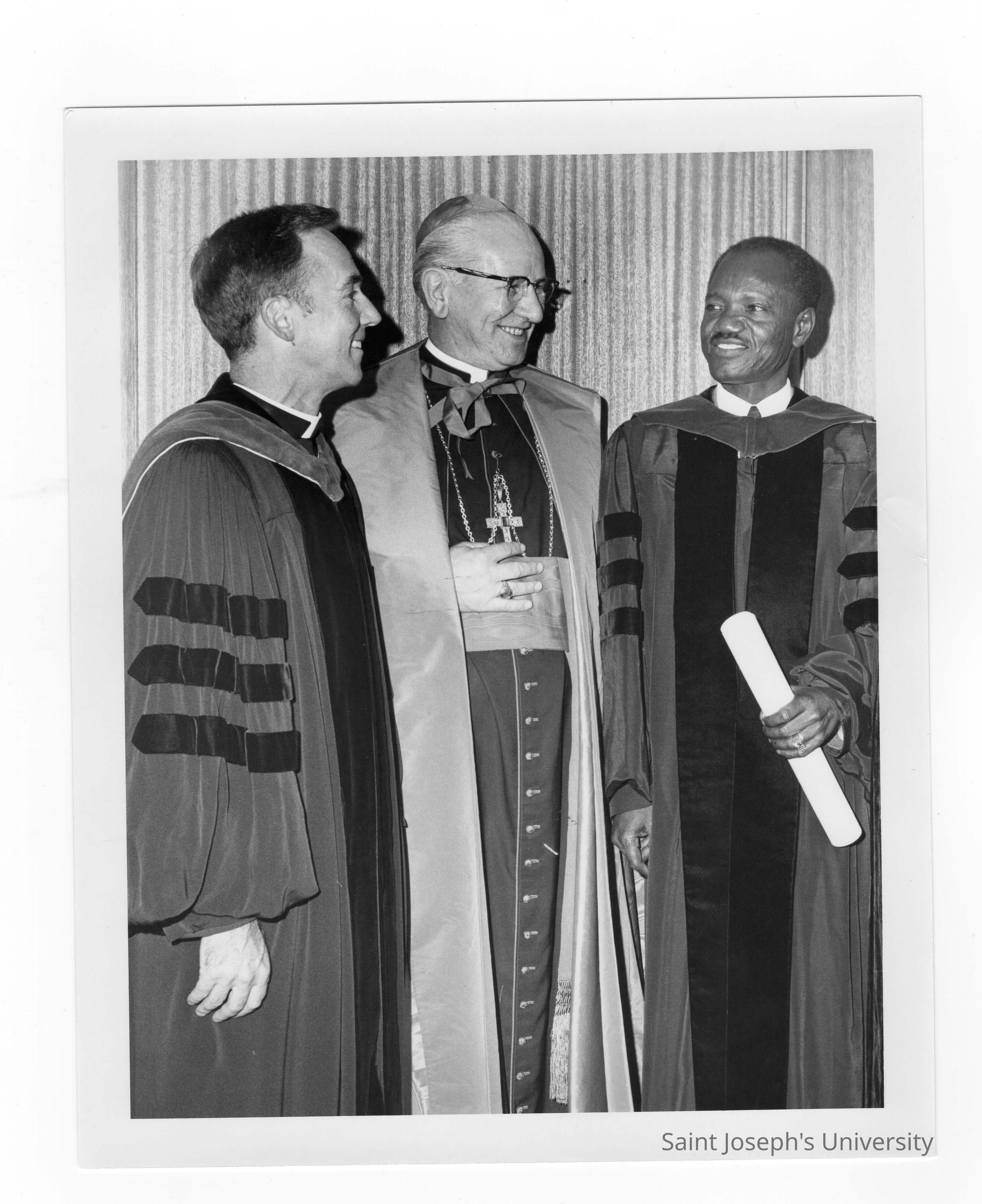 Terrence Toland, S.J., Francois Tombalbaye, President of Chad, and John Cardinal Krol during convocation, October 26, 1970. Cardinal Krol gave the invocation.