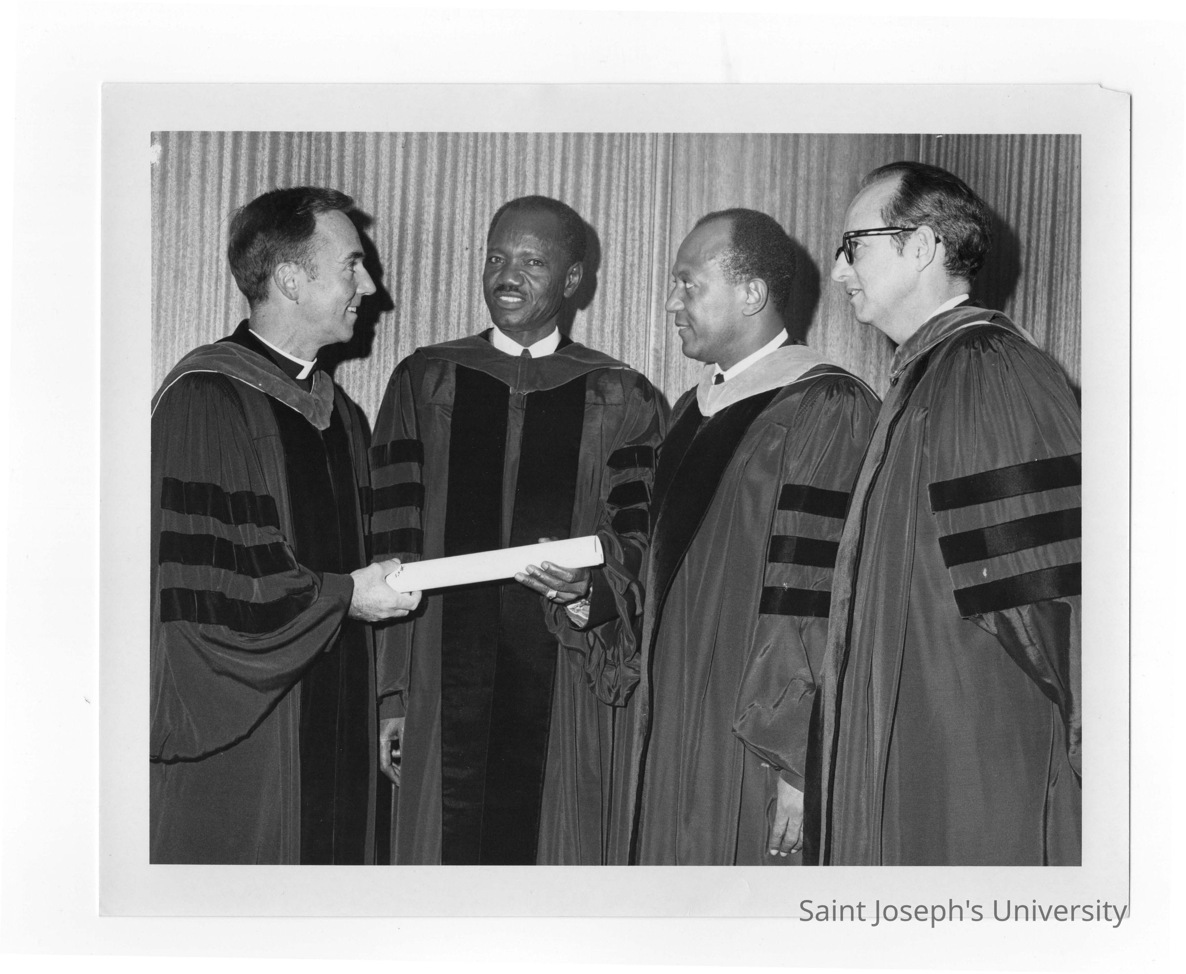Francois Tombalbaye, President of Chad receives congratulations from Terrence Toland, S.J., other dignitaries after convocation, October 26, 1970.