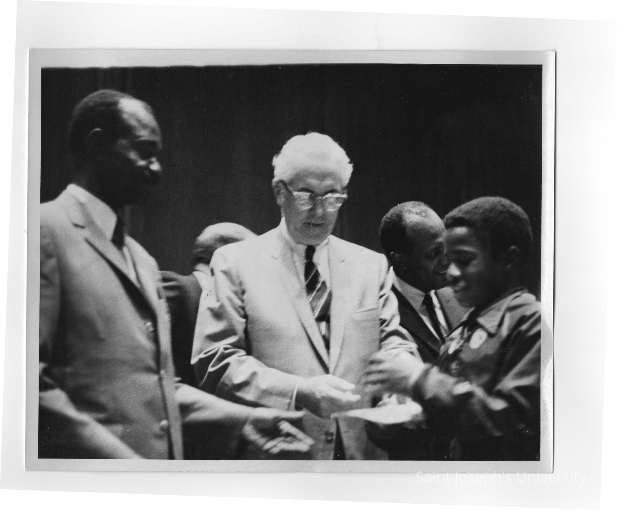 Francois Tombalbaye, President of Chad, and Mayor James Tate greeting child at reception following convocation, October 26, 1970.