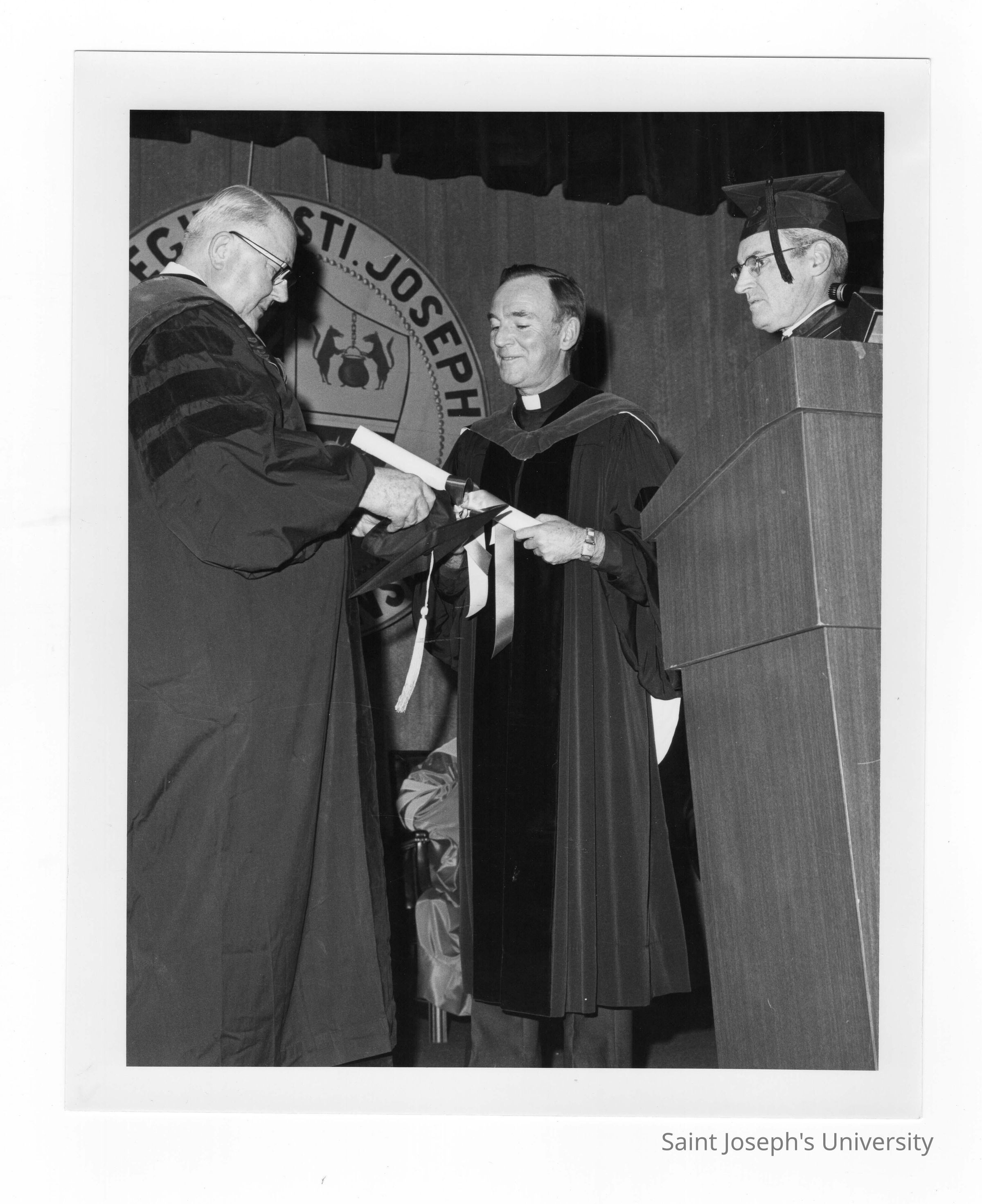 Terrence Toland, S.J., conferring honorary degree to Harry Boyer (?) with Michael J. Smith, S.J. watching during convocation on December 17, 1975.