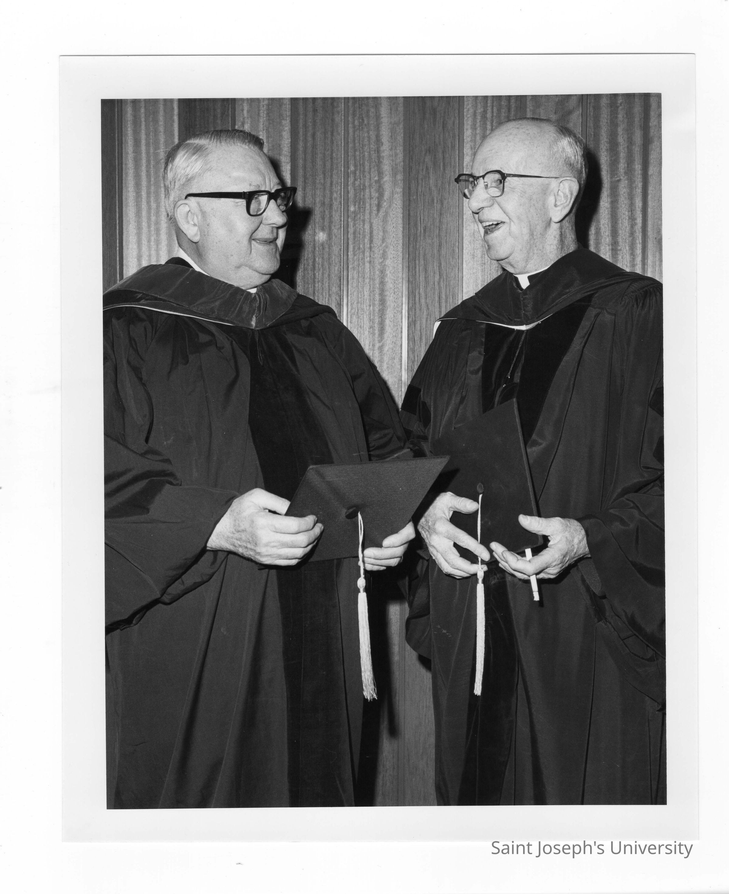 Dennis Comey, S.J., with honorary degree recipient, Harry Boyer (?) during convocation, December 17, 1975.