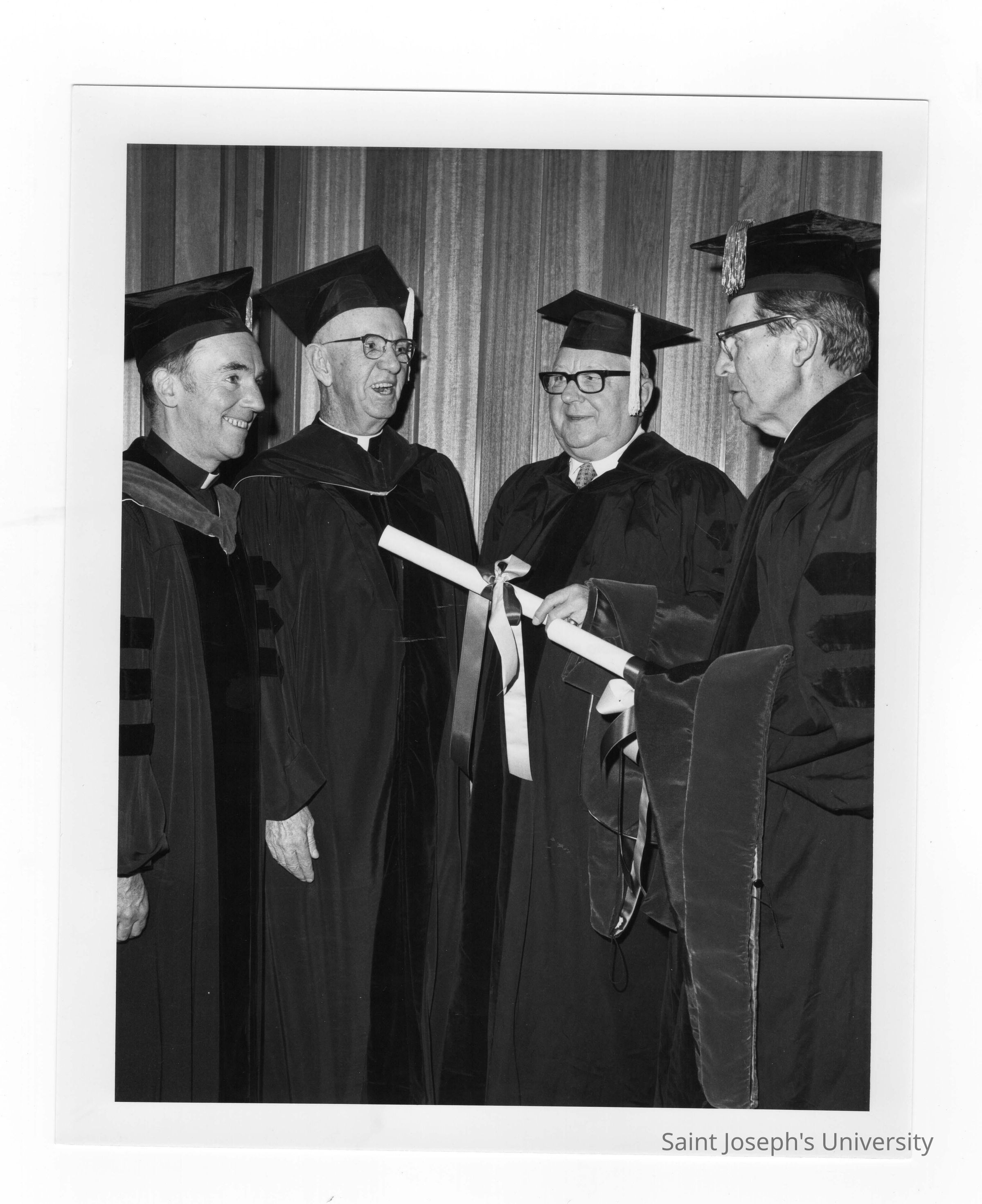 Terrence Toland, S.J., and Dennis Comey, S.J., with honorary degree recipients Harry Boyer (?) and Harry R. Halloran (?) during convocation, December 17, 1975.