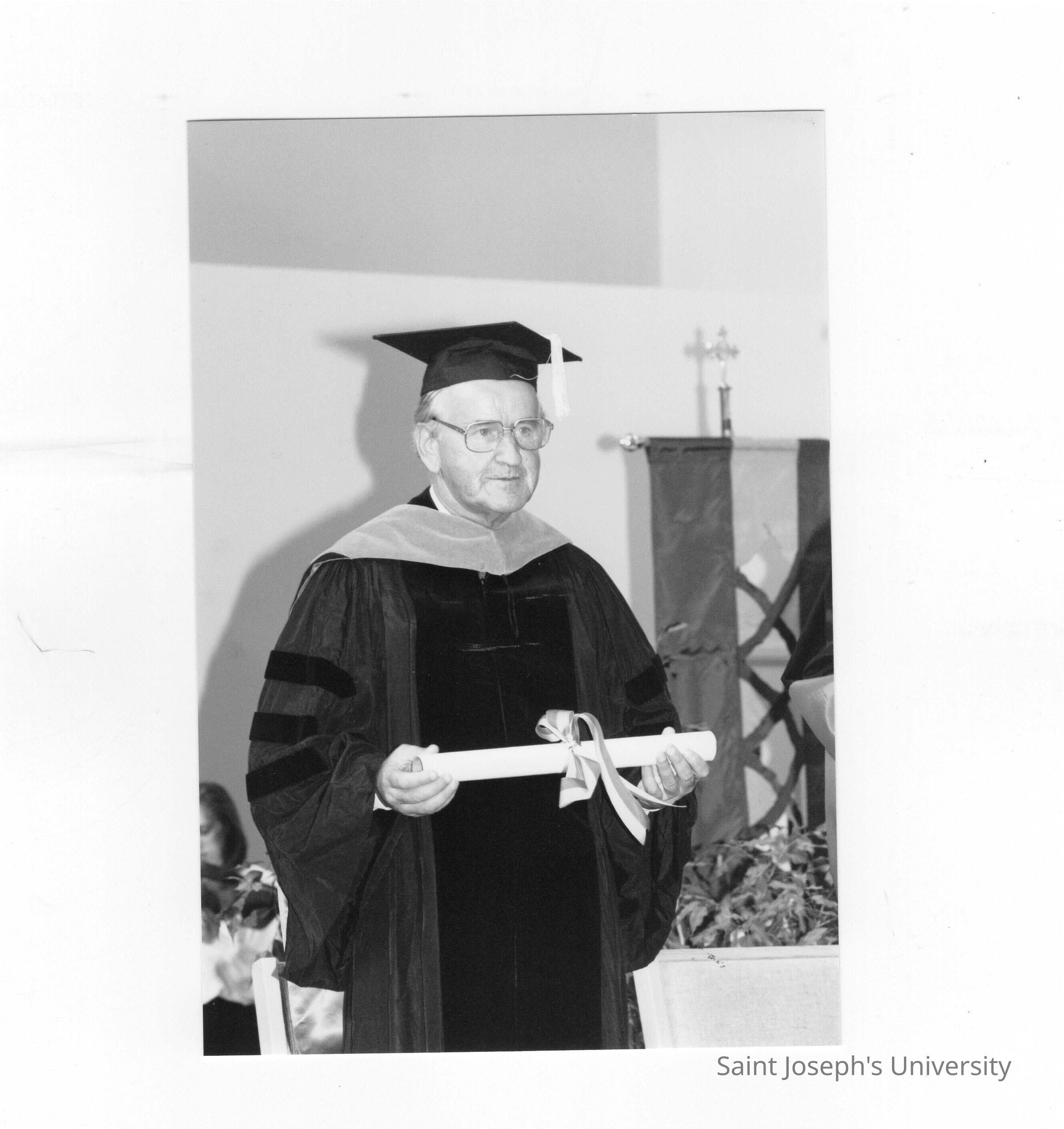 Views of honorary degree recipient, Prime Minister of Ireland, Albert Reynolds, with Nicholas S. Rashford, S.J., during convocation, October 6, 1994.