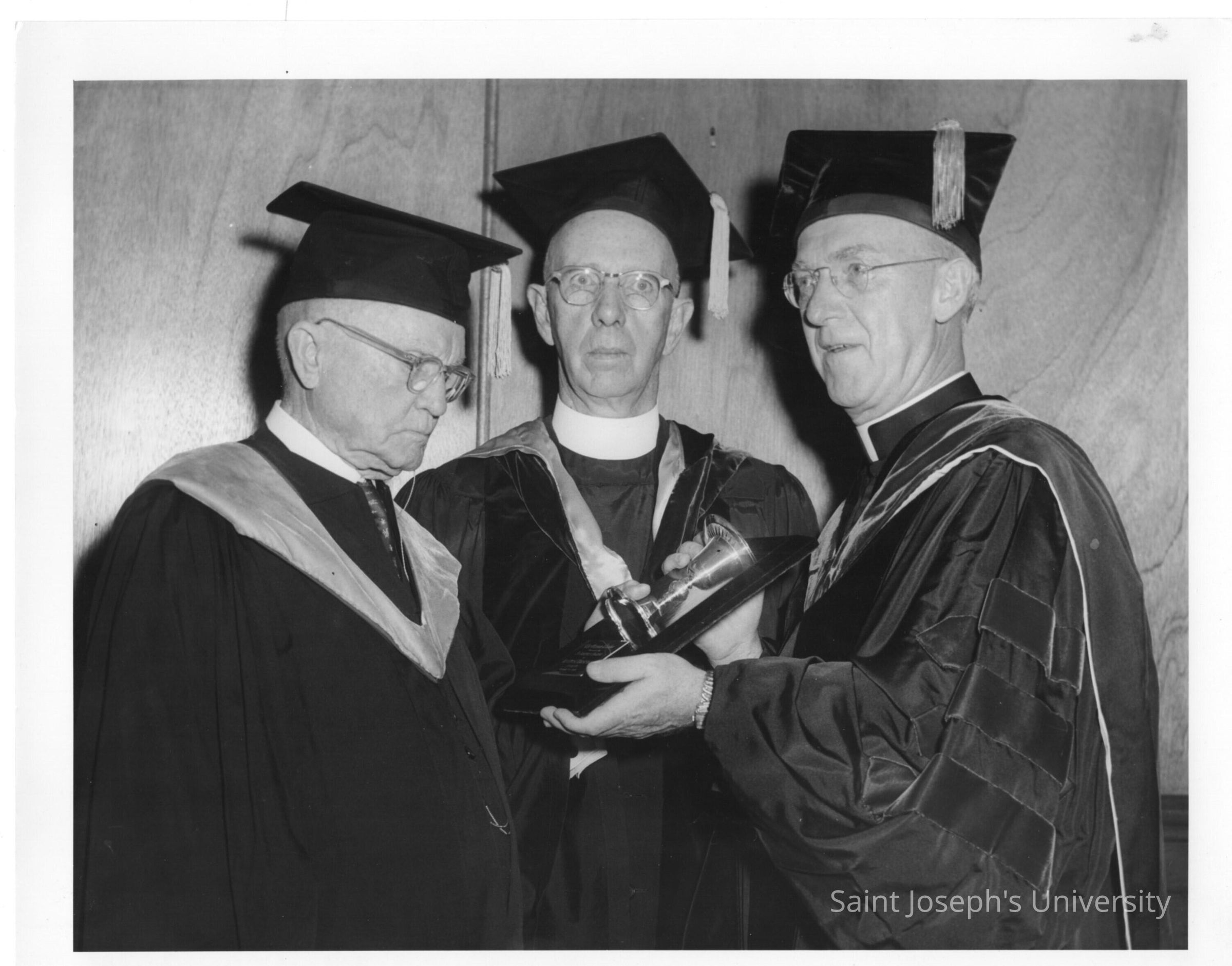 J. Joseph Bluett, S.J. and Dennis Comey, S.J. with Ignatius J. Horstmann, recipient of the Greaton Chalice at academic convocation, October 4, 1959.