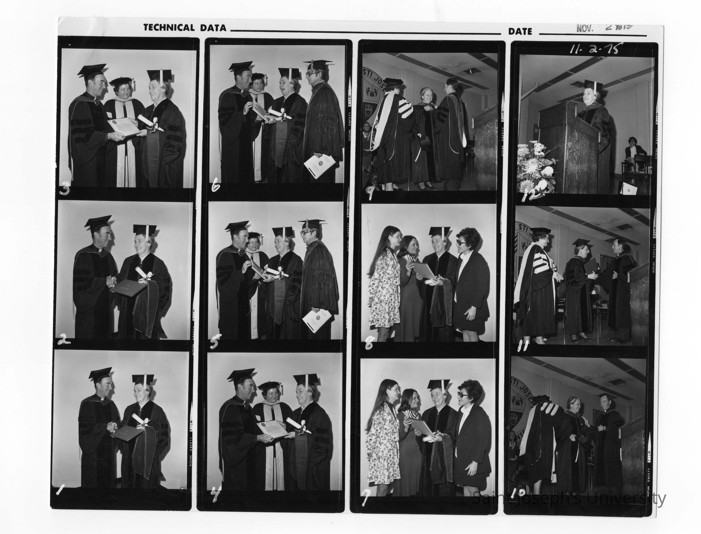 Views of academic convocation, November 2, 1975, with Terrence Toland, S.J., honorary degree recipient, the Honorable Martha Wright Griffiths, and others commemorating United Nations International Women's Year.
