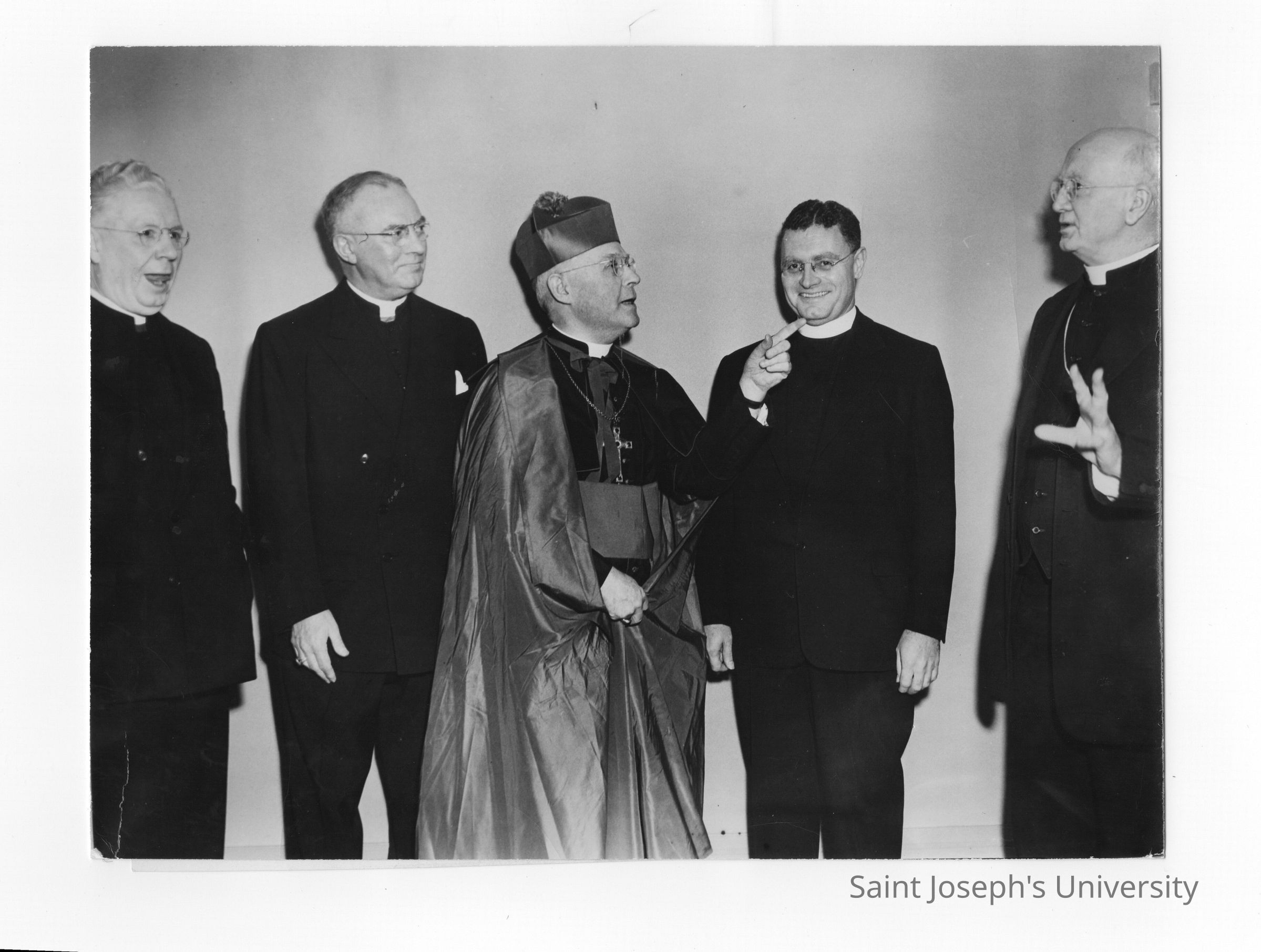 Edward G. Jacklin, S.J., Bishop George Leech, Archbishop Gerald O'Hara, Bishop Hugh Lamb, and Bishop Edward Fitzmaurice during banquet held in Field House as part of centennial anniversary celebration.