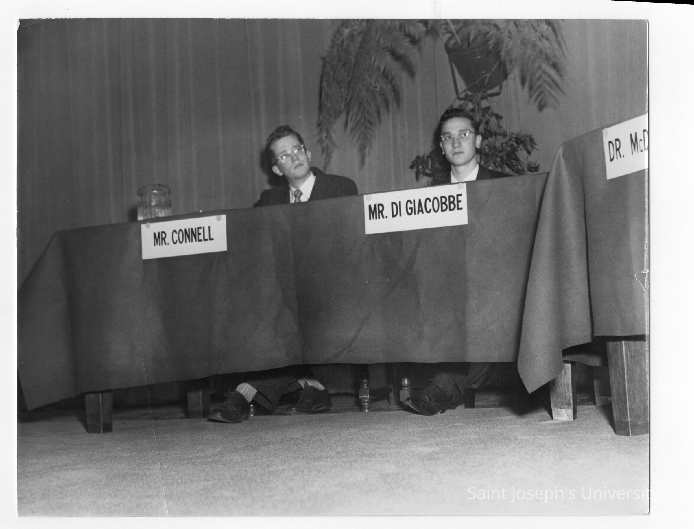 Two students, Milton Connell and Filindo DiGiacobbe, participating in Horatian Actus (Odes of Horace) during centennial celebration. Event held on October 26, 1951.