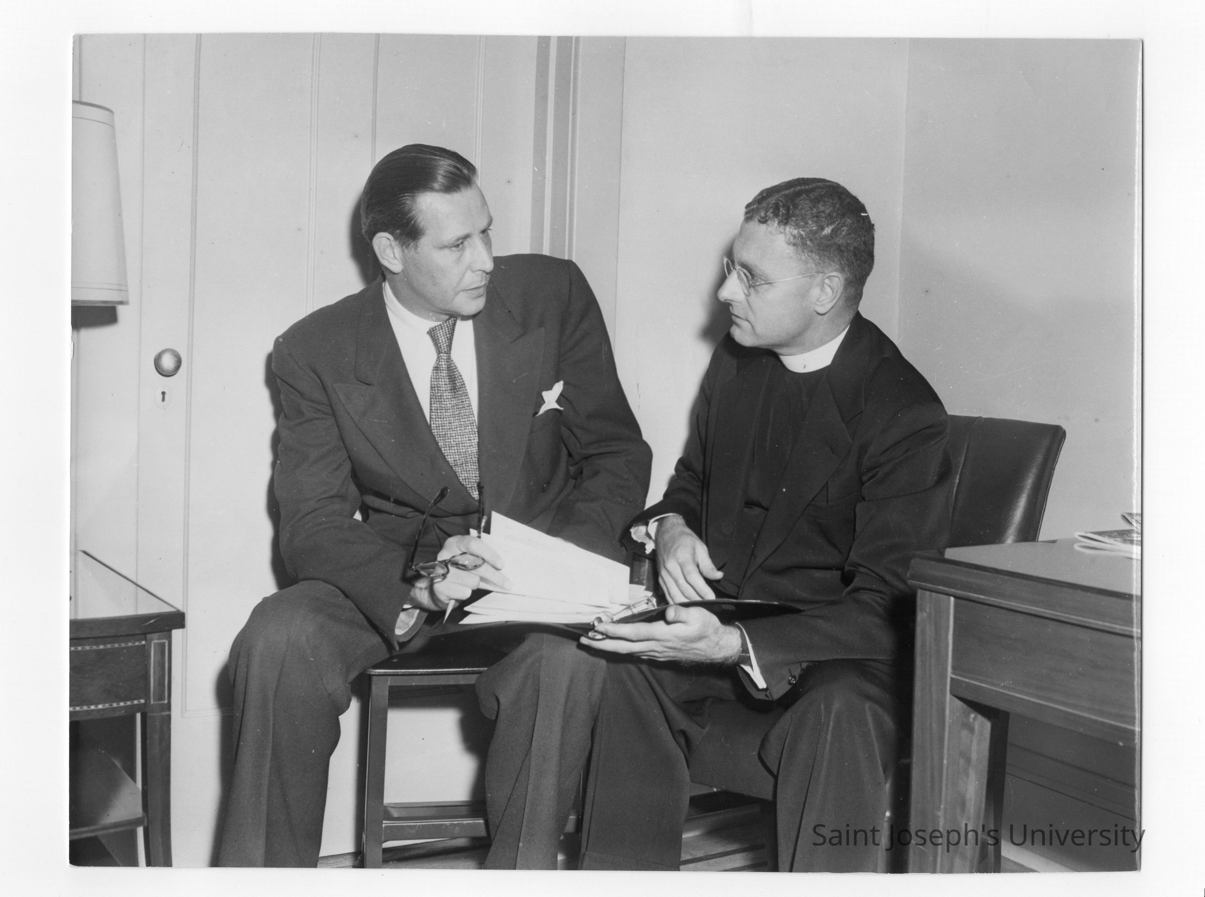 Edward G. Jacklin, S.J. talking with Maurice J. Tobin, U.S. Secretary of Labor during labor symposium on industrial relations held October 26, 1951 in Flanigan Auditorium during centennial celebration.