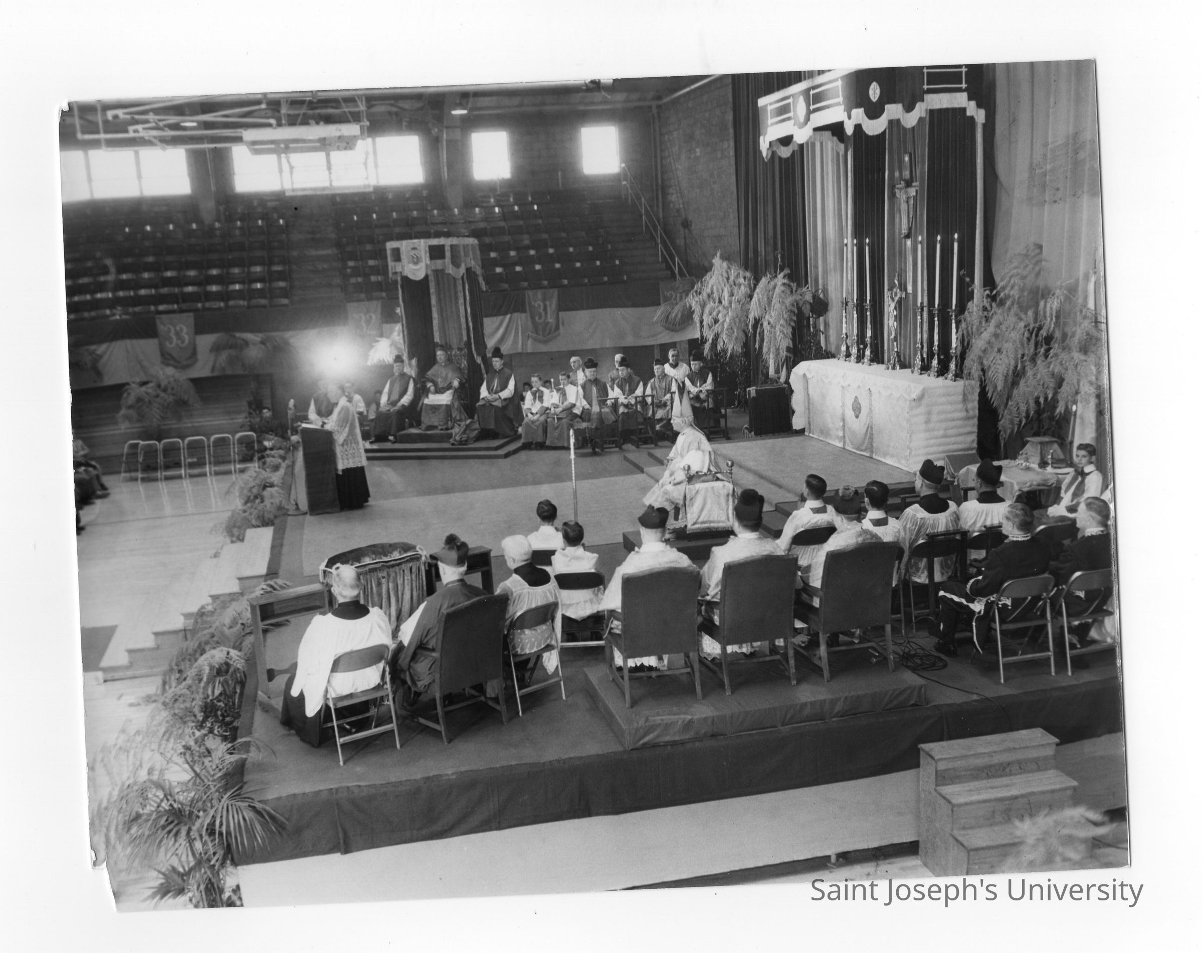 View of pontifical mass for centennial celebration held in Field House with Robert J. Gannon, S.J. giving sermon.