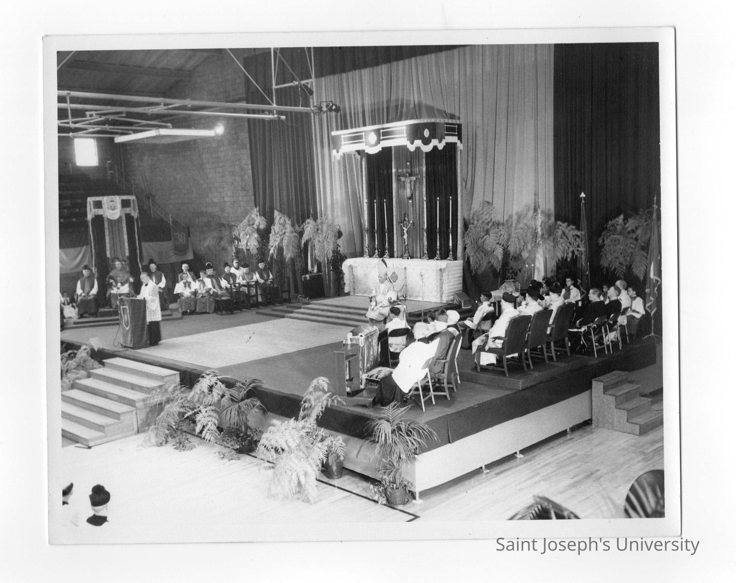 View of pontifical mass for centennial celebration held in Field House with Robert J. Gannon, S.J. giving sermon.