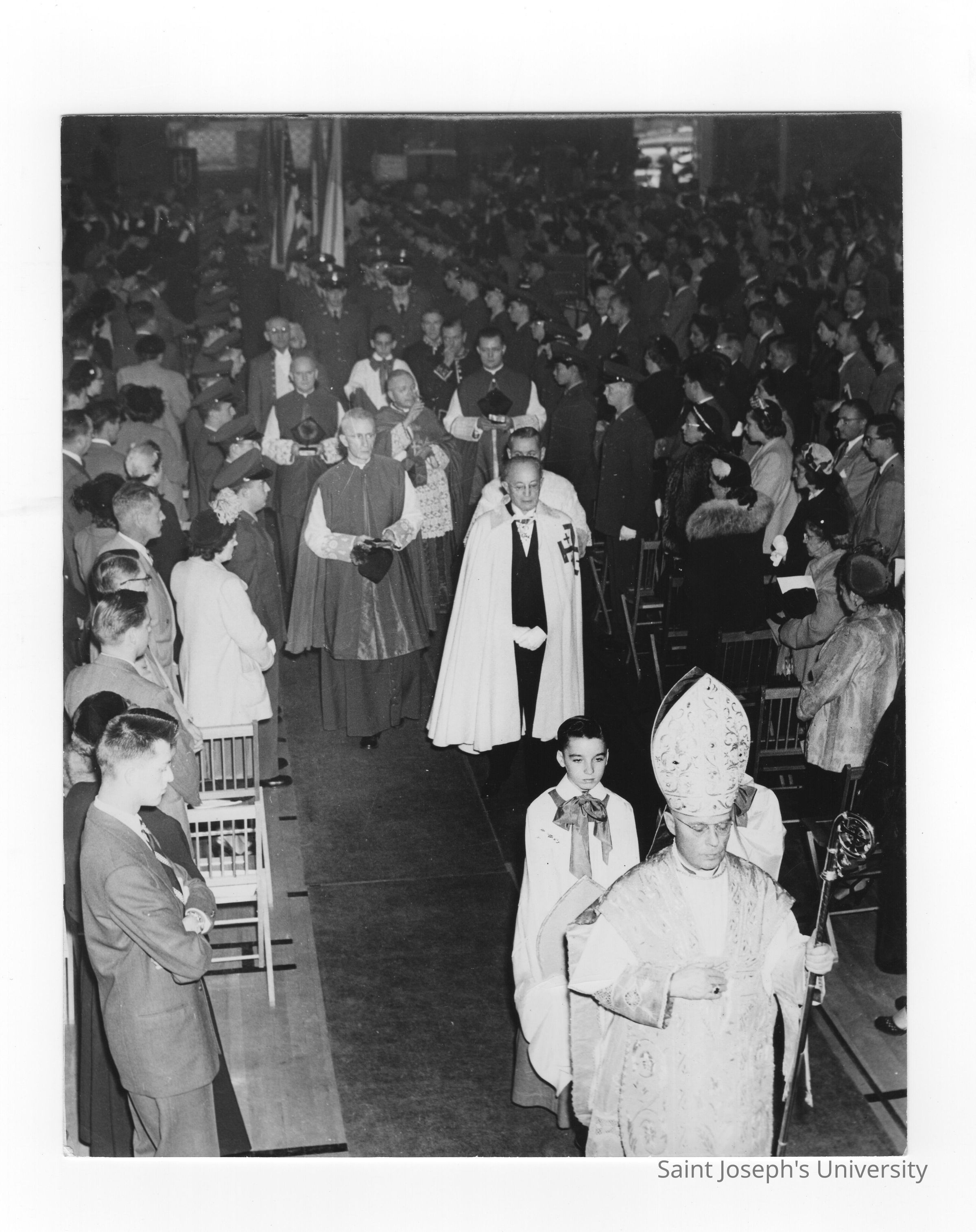 Recessional from pontifical mass for centennial celebration held in Field House, with Bishop Hugh Lamb, Amleto Giovanni Cicognani, and mr. Doyle (?)