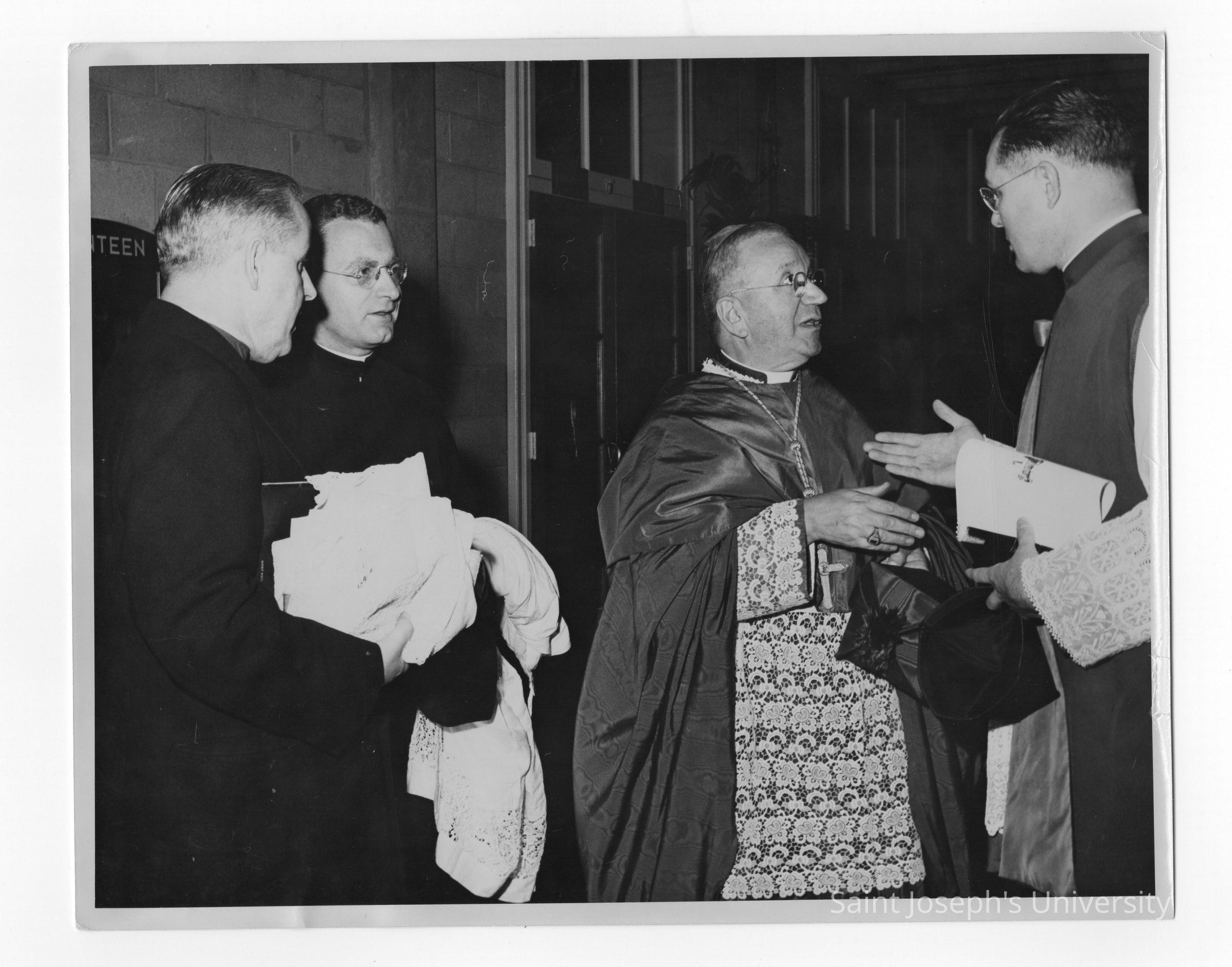 Conclusion of pontifical mass for centennial celebration held in Field House, with Monsignor Francis Furey, Edward G. Jacklin, S.J., Amleto Giovanni Cicognani, and Monsignor Joseph McShea.