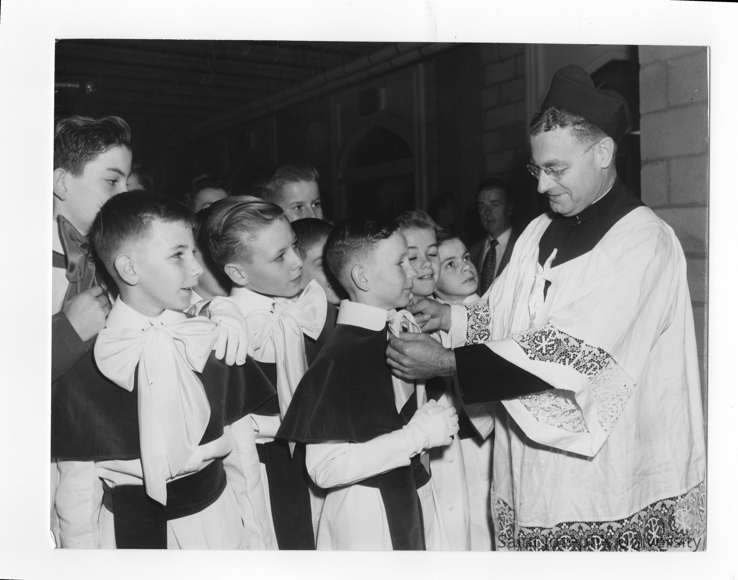 Altar boys with Edward G. Jacklin, S.J. during pontifical mass for centennial celebration held in Field House.