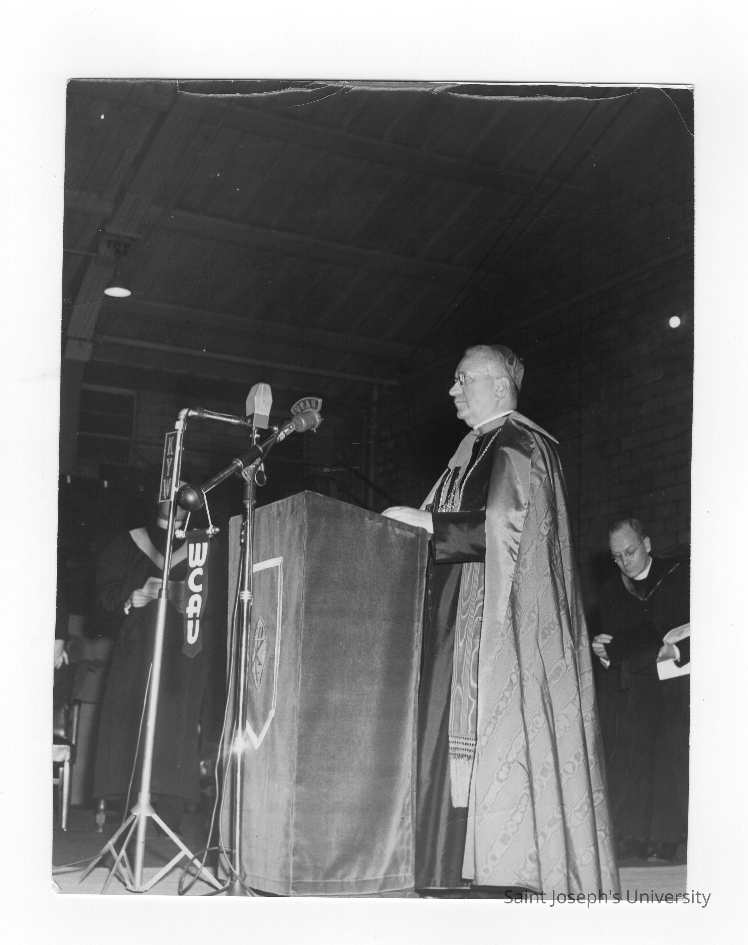 Apostolic delegate, Archbishop Amleto G. Cicognani, giving address at academic convocation, October 28, 1951, as part of centennial celebration.