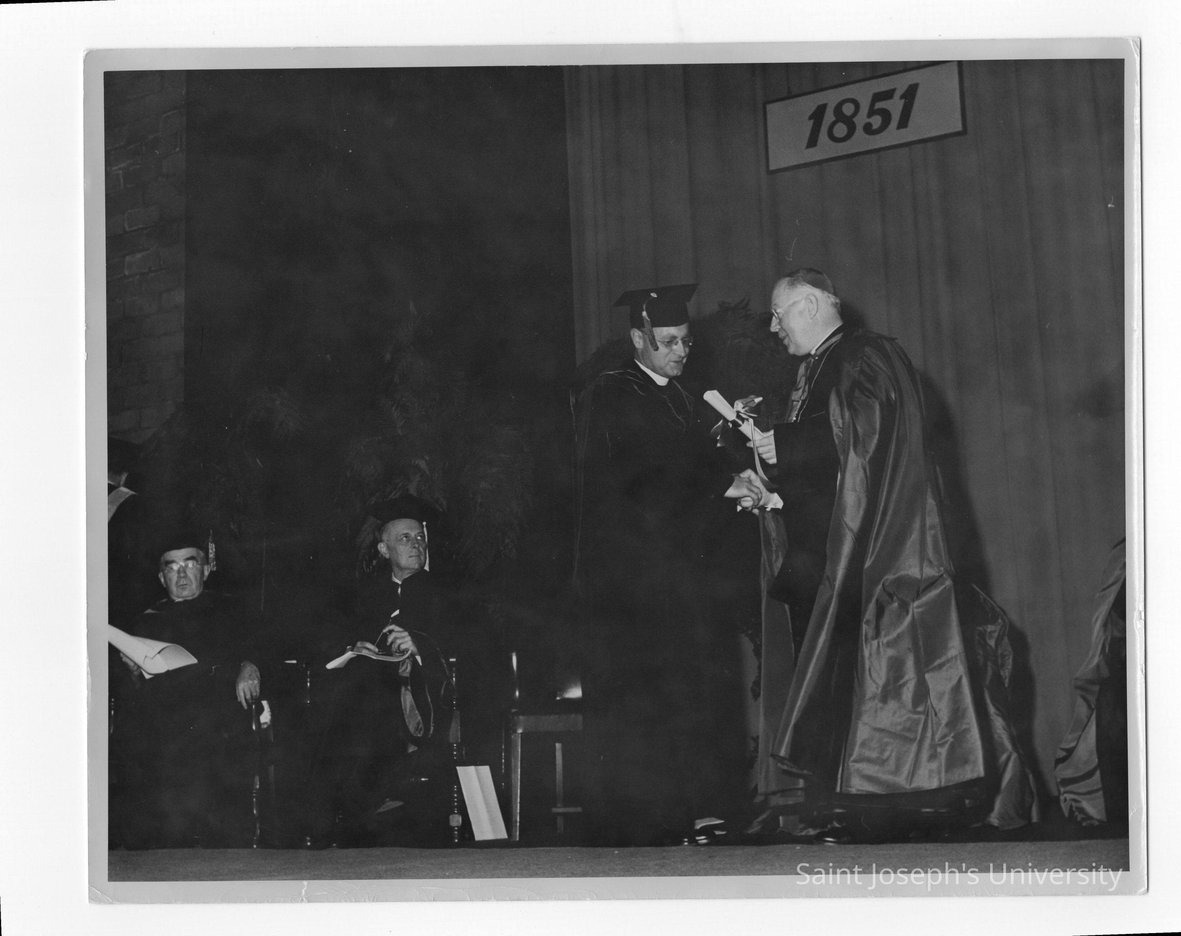 Edward G. Jacklin, S.J., conferring honorary degree on Bishop Thomas J. Feeney, S.J., during academic convocation, October 28, 1951, as part of centennial celebration. Joseph Hogan, S.J., and Thomas K. Finletter also on podium observing.Entry/Object ID